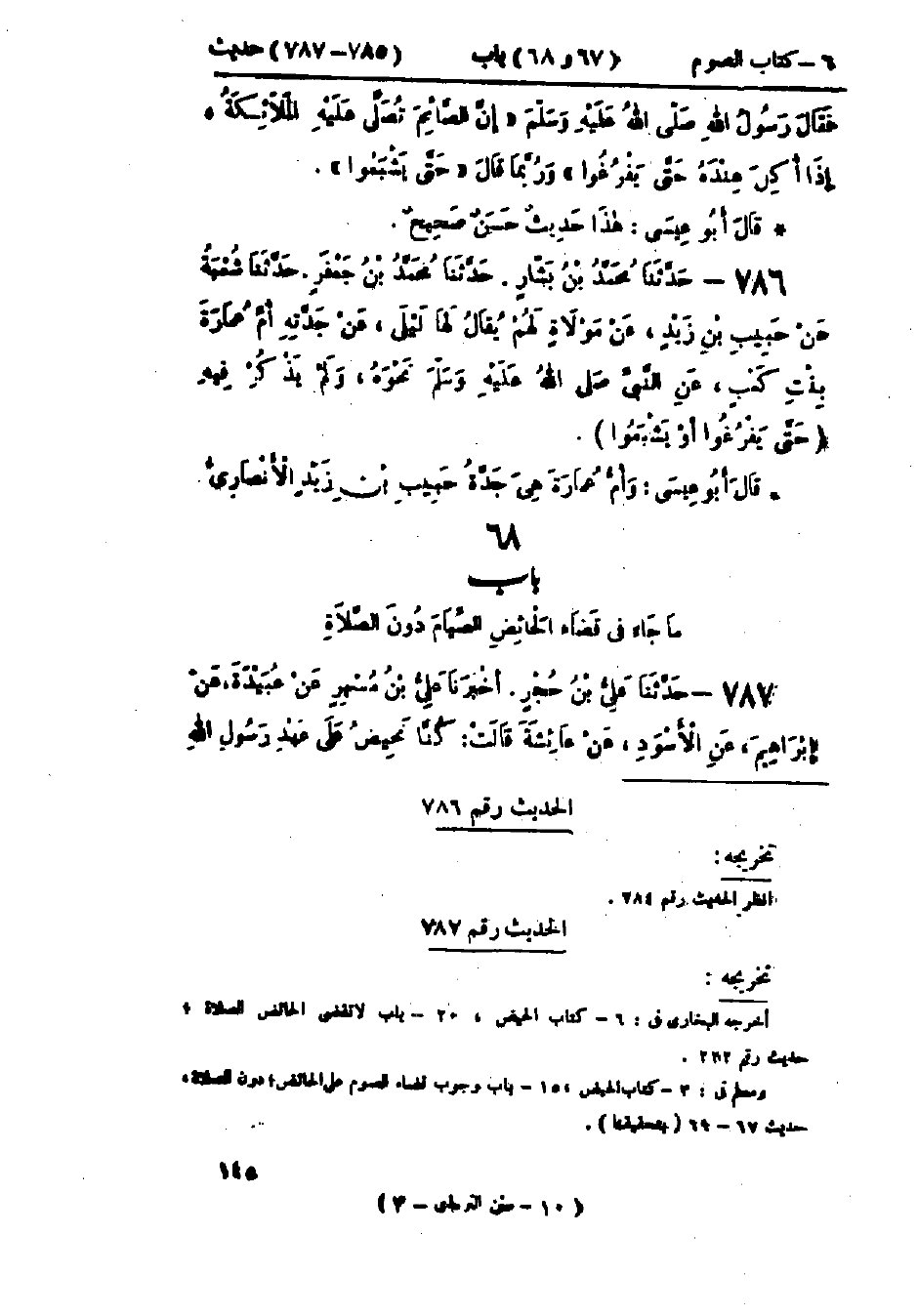 787 - حَدَّثَنَا عَلِيُّ بْنُ حُجْرٍ قَالَ: أَخْبَرَنَا عَلِيُّ بْنُ مُسْهِرٍ، عَنْ عُبَيْدَةَ، عَنْ إِبْرَاهِيمَ، عَنْ الأَسْوَدِ، عَنْ عَائِشَةَ قَالَتْ: §كُنَّا نَحِيضُ عَلَى عَهْدِ رَسُولِ اللَّهِ -[146]- صَلَّى اللَّهُ عَلَيْهِ وَسَلَّمَ، ثُمَّ نَطْهُرُ، «فَيَأْمُرُنَا بِقَضَاءِ الصِّيَامِ، وَلَا يَأْمُرُنَا بِقَضَاءِ الصَّلَاةِ»: «هَذَا حَدِيثٌ حَسَنٌ» وَقَدْ رُوِيَ عَنْ مُعَاذَةَ، عَنْ عَائِشَةَ أَيْضًا «وَالعَمَلُ عَلَى هَذَا عِنْدَ أَهْلِ العِلْمِ لَا نَعْلَمُ بَيْنَهُمْ اخْتِلَافًا، أَنَّ الْحَائِضَ تَقْضِي الصِّيَامَ وَلَا تَقْضِي الصَّلَاةَ»: «وَعُبَيْدَةُ هُوَ ابْنُ مُعَتِّبٍ الضَّبِّيُّ الكُوفِيُّ يُكْنَى أَبَا عَبْدِ الكَرِيمِ»