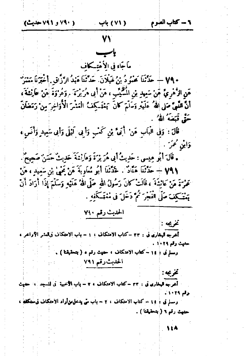 790 - حَدَّثَنَا مَحْمُودُ بْنُ غَيْلَانَ قَالَ: حَدَّثَنَا عَبْدُ الرَّزَّاقِ قَالَ: أَخْبَرَنَا مَعْمَرٌ، عَنْ الزُّهْرِيِّ، عَنْ سَعِيدِ بْنِ المُسَيِّبِ، عَنْ أَبِي هُرَيْرَةَ، وَعُرْوَةَ، عَنْ عَائِشَةَ، «أَنَّ النَّبِيَّ صَلَّى اللَّهُ عَلَيْهِ وَسَلَّمَ §كَانَ يَعْتَكِفُ العَشْرَ الأَوَاخِرَ مِنْ رَمَضَانَ حَتَّى قَبَضَهُ اللَّهُ». وَفِي البَابِ عَنْ أُبَيِّ بْنِ كَعْبٍ، وَأَبِي لَيْلَى، وَأَبِي سَعِيدٍ، وَأَنَسٍ، وَابْنِ عُمَرَ.: «حَدِيثُ أَبِي هُرَيْرَةَ، وَعَائِشَةَ حَدِيثٌ حَسَنٌ صَحِيحٌ»