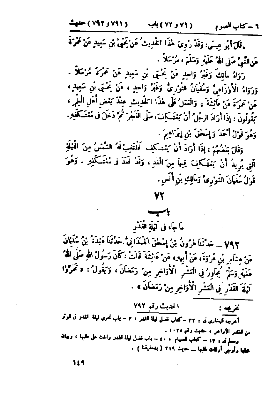 792 - حَدَّثَنَا هَارُونُ بْنُ إِسْحَاقَ الهَمْدَانِيُّ قَالَ: حَدَّثَنَا عَبْدَةُ بْنُ سُلَيْمَانَ، عَنْ هِشَامِ بْنِ عُرْوَةَ، عَنْ أَبِيهِ، عَنْ عَائِشَةَ قَالَتْ: كَانَ رَسُولُ اللَّهِ صَلَّى اللَّهُ عَلَيْهِ وَسَلَّمَ يُجَاوِرُ فِي العَشْرِ الأَوَاخِرِ مِنْ رَمَضَانَ، وَيَقُولُ: «§تَحَرَّوْا لَيْلَةَ القَدْرِ فِي العَشْرِ الأَوَاخِرِ مِنْ رَمَضَانَ» -[150]- وَفِي البَابِ عَنْ عُمَرَ، وَأُبَيٍّ، وَجَابِرِ بْنِ سَمُرَةَ، وَجَابِرِ بْنِ عَبْدِ اللَّهِ، وَابْنِ عُمَرَ، وَالفَلَتَانِ بْنِ عَاصِمٍ، وَأَنَسٍ، وَأَبِي سَعِيدٍ، وَعَبْدِ اللَّهِ بْنِ أُنَيْسٍ، وَأَبِي بَكْرَةَ، وَابْنِ عَبَّاسٍ، وَبِلَالٍ، وَعُبَادَةَ بْنِ الصَّامِتِ.: حَدِيثُ عَائِشَةَ حَدِيثٌ حَسَنٌ صَحِيحٌ، وَقَوْلُهَا: «يُجَاوِرُ» يَعْنِي: يَعْتَكِفُ وَأَكْثَرُ الرِّوَايَاتِ عَنِ النَّبِيِّ صَلَّى اللَّهُ عَلَيْهِ وَسَلَّمَ أَنَّهُ قَالَ: «التَمِسُوهَا فِي العَشْرِ الأَوَاخِرِ فِي كُلِّ وِتْرٍ»، «وَرُوِيَ عَنِ النَّبِيِّ صَلَّى اللَّهُ عَلَيْهِ وَسَلَّمَ فِي لَيْلَةِ القَدْرِ أَنَّهَا لَيْلَةُ إِحْدَى وَعِشْرِينَ، وَلَيْلَةُ ثَلَاثٍ وَعِشْرِينَ، وَخَمْسٍ وَعِشْرِينَ، وَسَبْعٍ وَعِشْرِينَ، وَتِسْعٍ وَعِشْرِينَ، وَآخِرُ لَيْلَةٍ مِنْ رَمَضَانَ».: قَالَ الشَّافِعِيُّ: " كَأَنَّ هَذَا عِنْدِي وَاللَّهُ أَعْلَمُ أَنَّ النَّبِيَّ صَلَّى اللَّهُ عَلَيْهِ وَسَلَّمَ كَانَ يُجِيبُ عَلَى نَحْوِ مَا يُسْأَلُ عَنْهُ، يُقَالُ لَهُ نَلْتَمِسُهَا فِي لَيْلَةِ كَذَا؟ فَيَقُولُ: «التَمِسُوهَا فِي لَيْلَةِ كَذَا». قَالَ الشَّافِعِيُّ: «وَأَقْوَى الرِّوَايَاتِ عِنْدِي فِيهَا لَيْلَةُ إِحْدَى وَعِشْرِينَ».: وَقَدْ رُوِيَ عَنْ أُبَيِّ بْنِ كَعْبٍ أَنَّهُ: " كَانَ يَحْلِفُ أَنَّهَا لَيْلَةُ سَبْعٍ وَعِشْرِينَ، وَيَقُولُ: أَخْبَرَنَا رَسُولُ اللَّهِ صَلَّى اللَّهُ عَلَيْهِ وَسَلَّمَ بِعَلَامَتِهَا فَعَدَدْنَا وَحَفِظْنَا "، وَرُوِيَ عَنْ أَبِي قِلَابَةَ أَنَّهُ قَالَ: «لَيْلَةُ القَدْرِ تَنْتَقِلُ فِي العَشْرِ الأَوَاخِرِ،» حَدَّثَنَا بِذَلِكَ عَبْدُ بْنُ حُمَيْدٍ قَالَ: أَخْبَرَنَا عَبْدُ الرَّزَّاقِ، عَنْ مَعْمَرٍ، عَنْ أَيُوبَ، عَنْ أَبِي قِلَابَةَ بِهَذَا