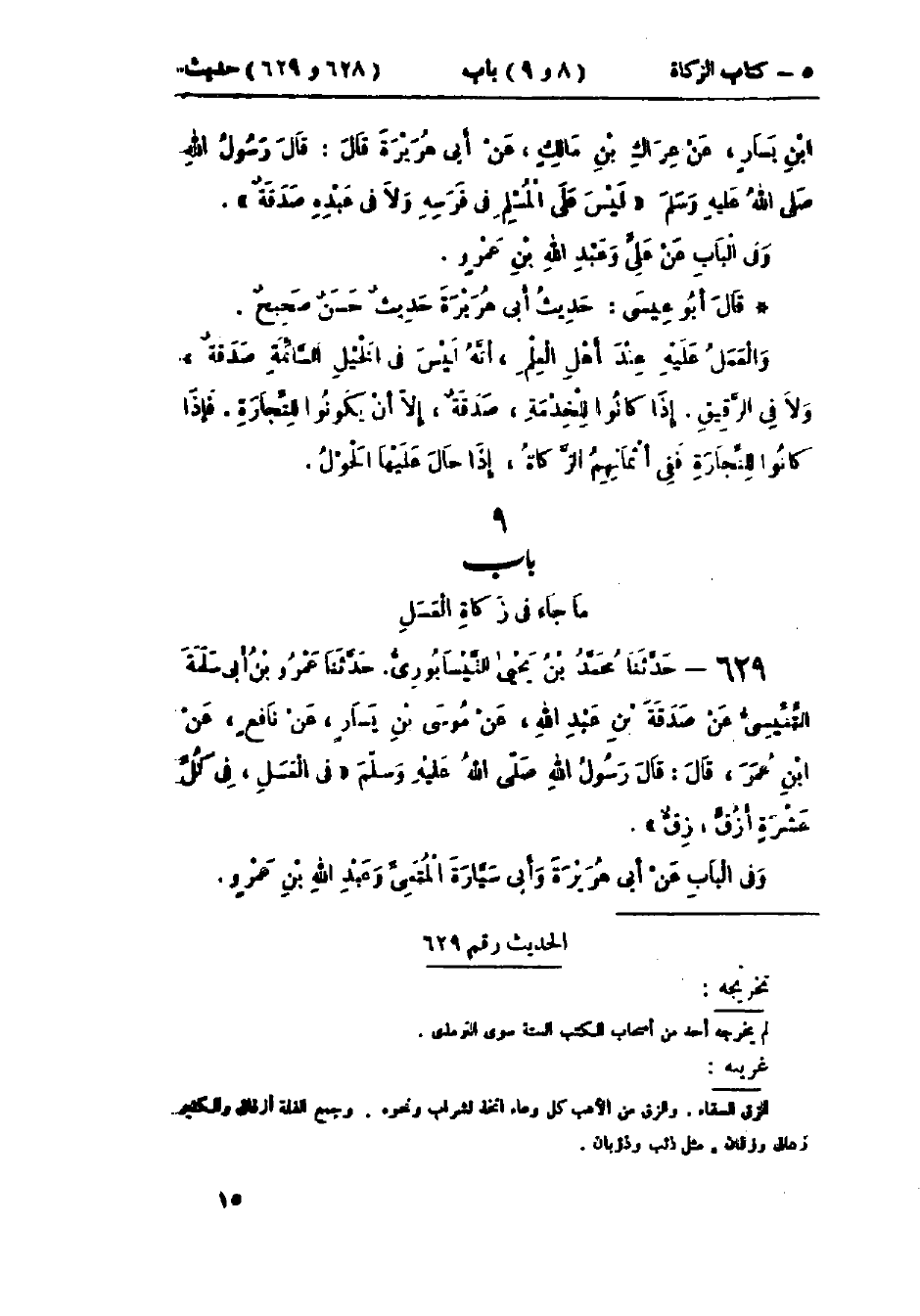 629 - حَدَّثَنَا مُحَمَّدُ بْنُ يَحْيَى النَّيْسَابُورِيُّ قَالَ: حَدَّثَنَا عَمْرُو بْنُ أَبِي سَلَمَةَ التِّنِّيسِيُّ، عَنْ صَدَقَةَ بْنِ عَبْدِ اللَّهِ، عَنْ مُوسَى بْنِ يَسَارٍ، عَنْ نَافِعٍ، عَنْ ابْنِ عُمَرَ قَالَ: قَالَ رَسُولُ اللَّهِ صَلَّى اللَّهُ عَلَيْهِ وَسَلَّمَ فِي العَسَلِ: «§فِي كُلِّ عَشَرَةِ أَزُقٍّ زِقٌّ»، وَفِي البَابِ عَنْ أَبِي هُرَيْرَةَ، وَأَبِي سَيَّارَةَ المُتُعِيِّ، وَعَبْدِ اللَّهِ بْنِ عَمْرٍو.: -[16]- «حَدِيثُ ابْنِ عُمَرَ فِي إِسْنَادِهِ مَقَالٌ»، «وَلَا يَصِحُّ عَنِ النَّبِيِّ صَلَّى اللَّهُ عَلَيْهِ وَسَلَّمَ فِي هَذَا البَابِ كَبِيرُ شَيْءٍ»، «وَالعَمَلُ عَلَى هَذَا عِنْدَ أَكْثَرِ أَهْلِ العِلْمِ وَبِهِ يَقُولُ أَحْمَدُ، وَإِسْحَاقُ»، " وقَالَ بَعْضُ أَهْلِ العِلْمِ: لَيْسَ فِي العَسَلِ شَيْءٌ «،» وَصَدَقَةُ بْنُ عَبْدِ اللَّهِ لَيْسَ بِحَافِظٍ، وَقَدْ خُولِفَ صَدَقَةُ بْنُ عَبْدِ اللَّهِ فِي رِوَايَةِ هَذَا الحَدِيثِ، عَنْ نَافِعٍ "