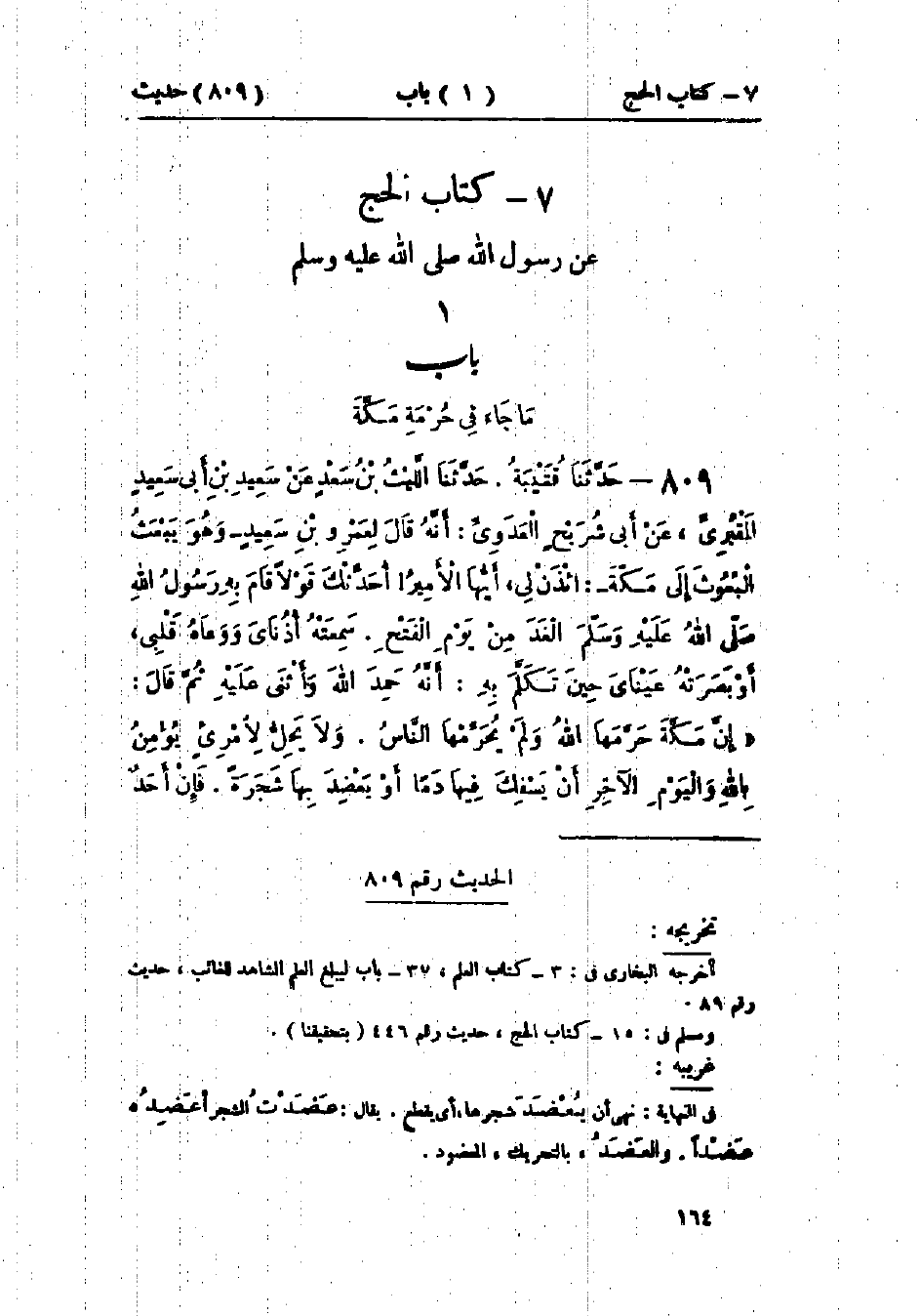 809 - حَدَّثَنَا قُتَيْبَةُ قَالَ: حَدَّثَنَا اللَّيْثُ بْنُ سَعْدٍ، عَنْ سَعِيدِ بْنِ أَبِي سَعِيدٍ المَقْبُرِيِّ، عَنْ أَبِي شُرَيْحٍ العَدَوِيِّ، أَنَّهُ قَالَ لِعَمْرِو بْنِ سَعِيدٍ وَهُوَ يَبْعَثُ البُعُوثَ إِلَى مَكَّةَ: ائْذَنْ لِي أَيُّهَا الأَمِيرُ، أُحَدِّثْكَ قَوْلًا قَامَ بِهِ رَسُولُ اللَّهِ صَلَّى اللَّهُ عَلَيْهِ وَسَلَّمَ الغَدَ مِنْ يَوْمِ الفَتْحِ سَمِعَتْهُ أُذُنَايَ، وَوَعَاهُ قَلْبِي، وَأَبْصَرَتْهُ عَيْنَايَ، حِينَ تَكَلَّمَ بِهِ أَنَّهُ: حَمِدَ اللَّهَ، وَأَثْنَى عَلَيْهِ، ثُمَّ قَالَ: " إِنَّ §مَكَّةَ حَرَّمَهَا اللَّهُ، وَلَمْ يُحَرِّمْهَا النَّاسُ، وَلَا يَحِلُّ لِامْرِئٍ يُؤْمِنُ بِاللَّهِ وَاليَوْمِ الآخِرِ أَنْ يَسْفِكَ فِيهَا دَمًا، أَوْ يَعْضِدَ بِهَا شَجَرَةً،، فَإِنْ أَحَدٌ -[165]- تَرَخَّصَ بِقِتَالِ رَسُولِ اللَّهِ صَلَّى اللَّهُ عَلَيْهِ وَسَلَّمَ فِيهَا فَقُولُوا لَهُ: إِنَّ اللَّهَ أَذِنَ لِرَسُولِهِ صَلَّى اللَّهُ عَلَيْهِ وَسَلَّمَ وَلَمْ يَأْذَنْ لَكَ، وَإِنَّمَا أَذِنَ لِي فِيهِ سَاعَةً مِنَ النَّهَارِ، وَقَدْ عَادَتْ حُرْمَتُهَا اليَوْمَ كَحُرْمَتِهَا بِالأَمْسِ، وَلْيُبَلِّغِ الشَّاهِدُ الغَائِبَ "، فَقِيلَ لِأَبِي شُرَيْحٍ: مَا قَالَ لَكَ عَمْرٌو؟ قَالَ: أَنَا أَعْلَمُ مِنْكَ بِذَلِكَ يَا أَبَا شُرَيْحٍ، إِنَّ الحَرَمَ لَا يُعِيذُ عَاصِيًا، وَلَا فَارًّا بِدَمٍ، وَلَا فَارًّا بِخَرْبَةٍ.: وَيُرْوَى وَلَا فَارًّا بِخِزْيَةٍ، وَفِي البَابِ عَنْ أَبِي هُرَيْرَةَ، وَابْنِ عَبَّاسٍ.: «حَدِيثُ أَبِي شُرَيْحٍ حَدِيثٌ حَسَنٌ صَحِيحٌ» وَأَبُو شُرَيْحٍ الخُزَاعِيُّ: اسْمُهُ خُوَيْلِدُ بْنُ عَمْرٍو، وَهُوَ العَدَوِيُّ، وَهُوَ الكَعْبِيُّ " وَمَعْنَى قَوْلِهِ: «وَلَا فَارًّا بِخَرْبَةٍ»، يَعْنِي: الجِنَايَةَ، يَقُولُ: مَنْ جَنَى جِنَايَةً، أَوْ أَصَابَ دَمًا، ثُمَّ لَجَأَ إِلَى الحَرَمِ فَإِنَّهُ يُقَامُ عَلَيْهِ الحَدُّ