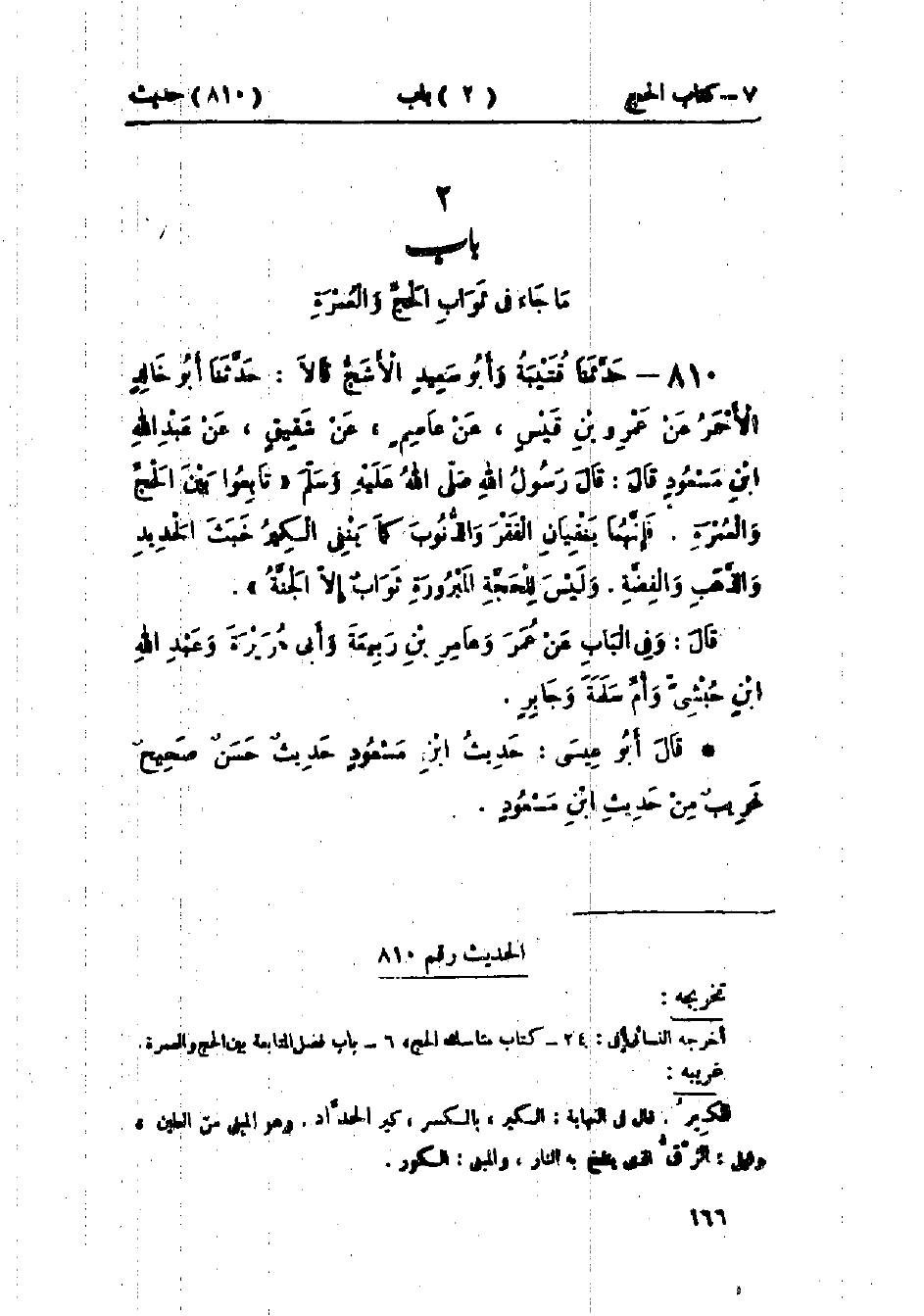 810 - حَدَّثَنَا قُتَيْبَةُ، وَأَبُو سَعِيدٍ الأَشَجُّ قَالَا: حَدَّثَنَا أَبُو خَالِدٍ الأَحْمَرُ، عَنْ عَمْرِو بْنِ قَيْسٍ، عَنْ عَاصِمٍ، عَنْ شَقِيقٍ، عَنْ عَبْدِ اللَّهِ بْنِ مَسْعُودٍ قَالَ: قَالَ رَسُولُ اللَّهِ صَلَّى اللَّهُ عَلَيْهِ وَسَلَّمَ: «§تَابِعُوا بَيْنَ الحَجِّ وَالعُمْرَةِ، فَإِنَّهُمَا يَنْفِيَانِ الفَقْرَ وَالذُّنُوبَ كَمَا يَنْفِي الكِيرُ خَبَثَ الحَدِيدِ، وَالذَّهَبِ، وَالفِضَّةِ، وَلَيْسَ لِلْحَجَّةِ المَبْرُورَةِ ثَوَابٌ إِلَّا الجَنَّةُ» وَفِي البَابِ عَنْ عُمَرَ، وَعَامِرِ بْنِ رَبِيعَةَ، وَأَبِي هُرَيْرَةَ، وَعَبْدِ اللَّهِ بْنِ حُبْشِيٍّ، وَأُمِّ سَلَمَةَ، وَجَابِرٍ.: «حَدِيثُ ابْنِ مَسْعُودٍ حَدِيثٌ حَسَنٌ صَحِيحٌ غَرِيبٌ مِنْ حَدِيثِ ابْنِ مَسْعُودٍ»
