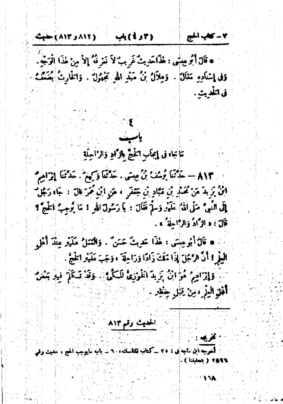 813 - حَدَّثَنَا يُوسُفُ بْنُ عِيسَى قَالَ: حَدَّثَنَا وَكِيعٌ قَالَ: حَدَّثَنَا إِبْرَاهِيمُ بْنُ يَزِيدَ، عَنْ مُحَمَّدِ بْنِ عَبَّادِ بْنِ جَعْفَرٍ، عَنْ ابْنِ عُمَرَ قَالَ: جَاءَ رَجُلٌ إِلَى النَّبِيِّ صَلَّى اللَّهُ عَلَيْهِ وَسَلَّمَ فَقَالَ: يَا رَسُولَ اللَّهِ، §مَا يُوجِبُ الحَجَّ؟ قَالَ: «الزَّادُ وَالرَّاحِلَةُ»: «هَذَا حَدِيثٌ حَسَنٌ» وَالعَمَلُ عَلَيْهِ عِنْدَ أَهْلِ العِلْمِ: أَنَّ الرَّجُلَ إِذَا مَلَكَ زَادًا وَرَاحِلَةً وَجَبَ عَلَيْهِ الحَجُّ «وَإِبْرَاهِيمُ هُوَ ابْنُ يَزِيدَ الخُوزِيُّ المَكِّيُّ وَقَدْ تَكَلَّمَ فِيهِ بَعْضُ أَهْلِ العِلْمِ مِنْ قِبَلِ حِفْظِهِ»