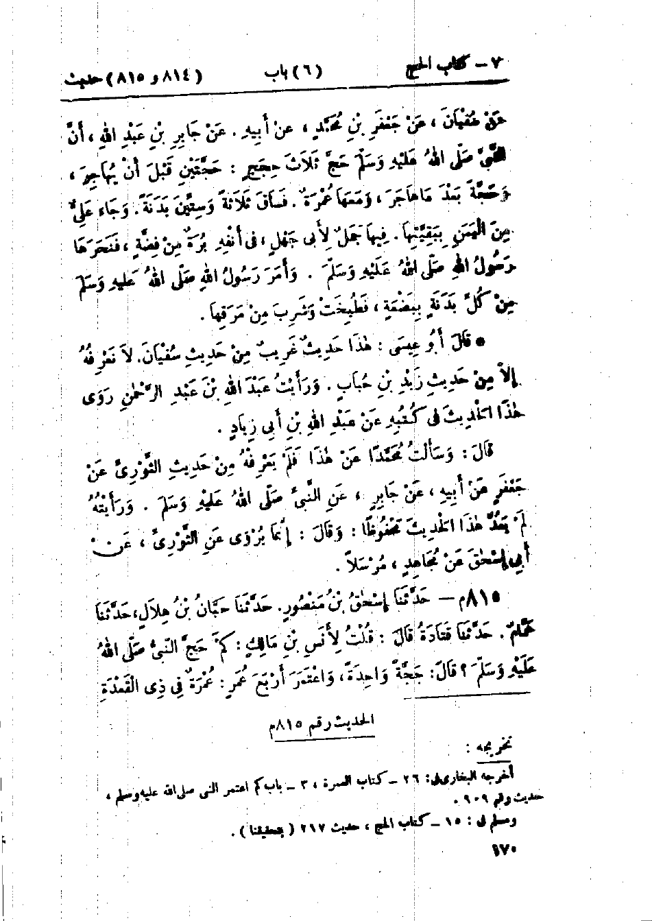 815 - حَدَّثَنَا إِسْحَاقُ بْنُ مَنْصُورٍ قَالَ: حَدَّثَنَا حَبَّانُ بْنُ هِلَالٍ قَالَ: حَدَّثَنَا هَمَّامٌ قَالَ: حَدَّثَنَا قَتَادَةُ، قَالَ: قُلْتُ لِأَنَسِ بْنِ مَالِكٍ: كَمْ حَجَّ النَّبِيُّ صَلَّى اللَّهُ عَلَيْهِ وَسَلَّمَ؟ قَالَ: " §حَجَّةً وَاحِدَةً، وَاعْتَمَرَ أَرْبَعَ عُمَرٍ: عُمْرَةٌ فِي ذِي القَعْدَةِ، -[171]- وَعُمْرَةُ الحُدَيْبِيَةِ، وَعُمْرَةٌ مَعَ حَجَّتِهِ، وَعُمْرَةُ الجِعِرَّانَةِ، إِذْ قَسَّمَ غَنِيمَةَ حُنَيْنٍ ": «هَذَا حَدِيثٌ حَسَنٌ صَحِيحٌ» وَحَبَّانُ بْنُ هِلَالٍ هُوَ أَبُو حَبِيبٍ البَصْرِيُّ هُوَ جَلِيلٌ ثِقَةٌ، وَثَّقَهُ يَحْيَى بْنُ سَعِيدٍ القَطَّانُ "
