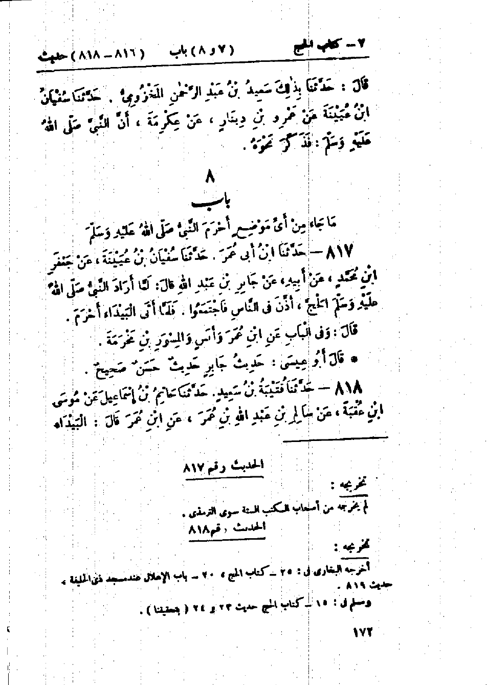 817 - حَدَّثَنَا ابْنُ أَبِي عُمَرَ قَالَ: حَدَّثَنَا سُفْيَانُ بْنُ عُيَيْنَةَ، عَنْ جَعْفَرِ بْنِ مُحَمَّدٍ، عَنْ أَبِيهِ، عَنْ جَابِرِ بْنِ عَبْدِ اللَّهِ قَالَ: «لَمَّا أَرَادَ النَّبِيُّ صَلَّى اللَّهُ عَلَيْهِ وَسَلَّمَ الحَجَّ §أَذَّنَ فِي النَّاسِ، فَاجْتَمَعُوا إِلَيْهِ، فَلَمَّا أَتَى البَيْدَاءَ أَحْرَمَ» وَفِي البَابِ عَنْ ابْنِ عُمَرَ، وَأَنَسٍ، وَالمِسْوَرِ بْنِ مَخْرَمَةَ.: «حَدِيثُ جَابِرٍ حَدِيثٌ حَسَنٌ صَحِيحٌ»