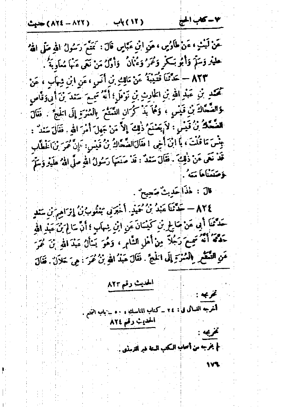 823 - حَدَّثَنَا قُتَيْبَةُ، عَنْ مَالِكِ بْنِ أَنَسٍ، عَنْ ابْنِ شِهَابٍ، عَنْ مُحَمَّدِ بْنِ عَبْدِ اللَّهِ بْنِ الحَارِثِ بْنِ نَوْفَلٍ، أَنَّهُ سَمِعَ سَعْدَ بْنَ أَبِي وَقَّاصٍ، وَالضَّحَّاكَ بْنَ قَيْسٍ وَهُمَا يَذْكُرَانِ التَّمَتُّعَ بِالعُمْرَةِ إِلَى الحَجِّ، فَقَالَ الضَّحَّاكُ بْنُ قَيْسٍ: لَا يَصْنَعُ ذَلِكَ إِلَّا مَنْ جَهِلَ أَمْرَ اللَّهِ، فَقَالَ سَعْدٌ: بِئْسَ مَا قُلْتَ يَا ابْنَ أَخِي، فَقَالَ الضَّحَّاكُ بْنُ قَيْسٍ: فَإِنَّ عُمَرَ بْنَ الخَطَّابِ قَدْ نَهَى عَنْ ذَلِكَ، فَقَالَ سَعْدٌ: «قَدْ §صَنَعَهَا رَسُولُ اللَّهِ صَلَّى اللَّهُ عَلَيْهِ وَسَلَّمَ، وَصَنَعْنَاهَا مَعَهُ» هَذَا حَدِيثٌ صَحِيحٌ "