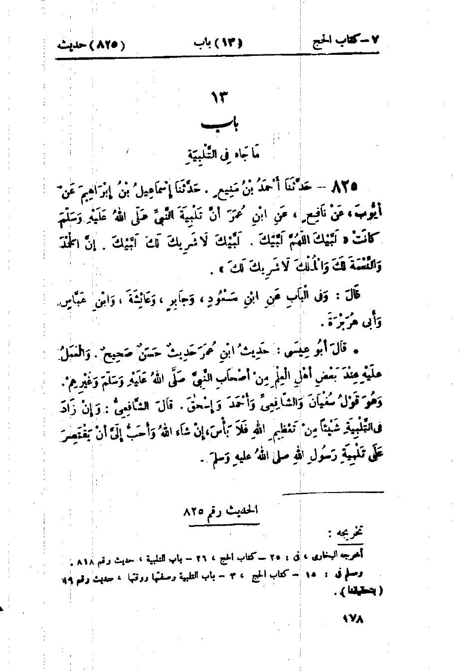 825 - حَدَّثَنَا أَحْمَدُ بْنُ مَنِيعٍ قَالَ: حَدَّثَنَا إِسْمَاعِيلُ بْنُ إِبْرَاهِيمَ، عَنْ أَيُّوبَ، عَنْ نَافِعٍ، عَنْ ابْنِ عُمَرَ، أَنَّ تَلْبِيَةَ النَّبِيِّ صَلَّى اللَّهُ عَلَيْهِ وَسَلَّمَ كَانَتْ: «§لَبَّيْكَ اللَّهُمَّ لَبَّيْكَ، لَبَّيْكَ لَا شَرِيكَ لَكَ لَبَّيْكَ، إِنَّ الحَمْدَ وَالنِّعْمَةَ لَكَ، وَالمُلْكَ لَا شَرِيكَ لَكَ» وَفِي البَابِ عَنْ ابْنِ مَسْعُودٍ، وَجَابِرٍ، وَعَائِشَةَ، وَابْنِ عَبَّاسٍ، وَأَبِي هُرَيْرَةَ.: «حَدِيثُ ابْنِ عُمَرَ حَدِيثٌ حَسَنٌ صَحِيحٌ» وَالعَمَلُ عَلَيْهِ عِنْدَ بَعْضِ أَهْلِ العِلْمِ مِنْ أَصْحَابِ النَّبِيِّ صَلَّى اللَّهُ عَلَيْهِ وَسَلَّمَ وَغَيْرِهِمْ، وَهُوَ قَوْلُ سُفْيَانَ، وَالشَّافِعِيِّ، وَأَحْمَدَ، وَإِسْحَاقَ " قَالَ الشَّافِعِيُّ: «وَإِنْ زَادَ فِي التَّلْبِيَةِ شَيْئًا مِنْ تَعْظِيمِ اللَّهِ فَلَا بَأْسَ إِنْ شَاءَ اللَّهُ، وَأَحَبُّ إِلَيَّ أَنْ يَقْتَصِرَ عَلَى تَلْبِيَةِ رَسُولِ اللَّهِ صَلَّى اللَّهُ عَلَيْهِ وَسَلَّمَ» -[179]- قَالَ الشَّافِعِيُّ: " وَإِنَّمَا قُلْنَا لَا بَأْسَ بِزِيَادَةِ تَعْظِيمِ اللَّهِ فِيهَا لِمَا جَاءَ عَنْ ابْنِ عُمَرَ وَهُوَ حَفِظَ التَّلْبِيَةَ عَنْ رَسُولِ اللَّهِ صَلَّى اللَّهُ عَلَيْهِ وَسَلَّمَ، ثُمَّ زَادَ ابْنُ عُمَرَ فِي تَلْبِيَتِهِ مِنْ قِبَلِهِ: لَبَّيْكَ وَالرَّغْبَاءُ إِلَيْكَ وَالعَمَلُ "