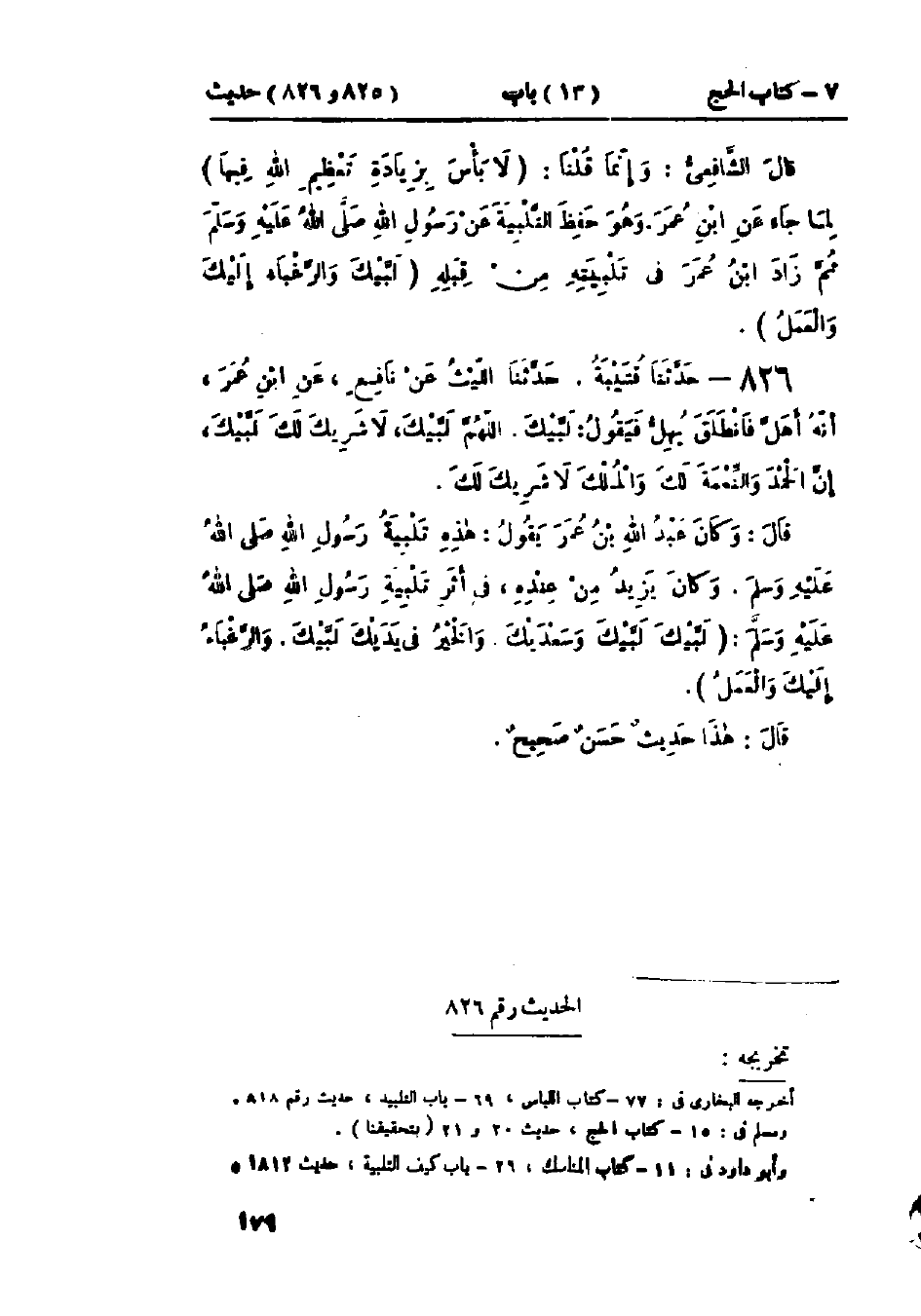 826 - حَدَّثَنَا قُتَيْبَةُ قَالَ: حَدَّثَنَا اللَّيْثُ، عَنْ نَافِعٍ، عَنْ ابْنِ عُمَرَ، أَنَّهُ أَهَلَّ فَانْطَلَقَ يُهِلُّ، فَيَقُولُ: «§لَبَّيْكَ اللَّهُمَّ لَبَّيْكَ، لَا شَرِيكَ لَكَ لَبَّيْكَ، إِنَّ الحَمْدَ وَالنِّعْمَةَ لَكَ وَالمُلْكَ، لَا شَرِيكَ لَكَ»، وَكَانَ عَبْدُ اللَّهِ بْنُ عُمَرَ يَقُولُ: " هَذِهِ تَلْبِيَةُ رَسُولِ اللَّهِ صَلَّى اللَّهُ عَلَيْهِ وَسَلَّمَ، وَكَانَ يَزِيدُ مِنْ عِنْدِهِ فِي أَثَرِ تَلْبِيَةِ رَسُولِ اللَّهِ صَلَّى اللَّهُ عَلَيْهِ وَسَلَّمَ: «لَبَّيْكَ، لَبَّيْكَ وَسَعْدَيْكَ، وَالخَيْرُ فِي يَدَيْكَ، لَبَّيْكَ وَالرَّغْبَاءُ إِلَيْكَ وَالعَمَلُ» هَذَا حَدِيثٌ حَسَنٌ صَحِيحٌ "