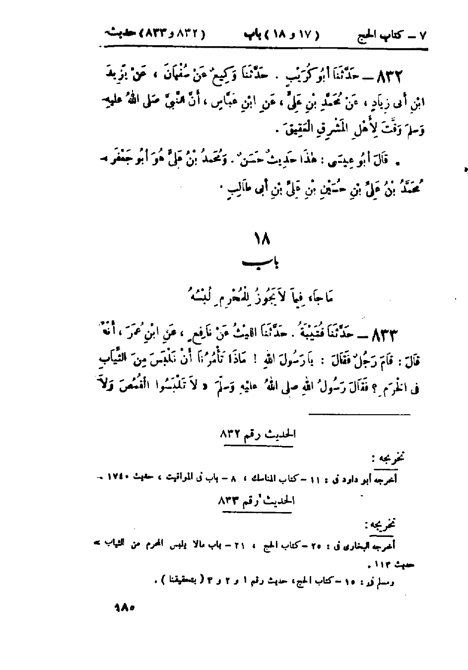 833 - حَدَّثَنَا قُتَيْبَةُ قَالَ: حَدَّثَنَا اللَّيْثُ، عَنْ نَافِعٍ، عَنْ ابْنِ عُمَرَ، أَنَّهُ قَالَ: قَامَ رَجُلٌ، فَقَالَ: يَا رَسُولَ اللَّهِ، مَاذَا تَأْمُرُنَا أَنْ نَلْبَسَ مِنَ الثِّيَابِ فِي الحَرَمِ؟ فَقَالَ رَسُولُ اللَّهِ صَلَّى اللَّهُ عَلَيْهِ وَسَلَّمَ: «§لَا تَلْبَسُوا القُمُصَ، وَلَا -[186]- السَّرَاوِيلَاتِ، وَلَا البَرَانِسَ، وَلَا العَمَائِمَ، وَلَا الخِفَافَ، إِلَّا أَنْ يَكُونَ أَحَدٌ لَيْسَتْ لَهُ نَعْلَانِ فَلْيَلْبَسِ الخُفَّيْنِ، وَلْيَقْطَعْهُمَا مَا أَسْفَلَ مِنَ الكَعْبَيْنِ، وَلَا تَلْبَسُوا شَيْئًا مِنَ الثِّيَابِ مَسَّهُ الزَّعْفَرَانُ، وَلَا الوَرْسُ، وَلَا تَنْتَقِبِ المَرْأَةُ الحَرَامُ، وَلَا تَلْبَسِ القُفَّازَيْنِ»: «هَذَا حَدِيثٌ حَسَنٌ صَحِيحٌ، وَالعَمَلُ عَلَيْهِ عِنْدَ أَهْلِ العِلْمِ»