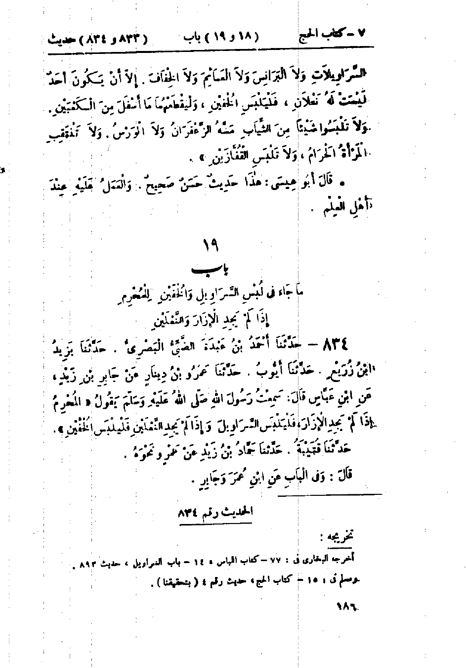 834 - حَدَّثَنَا أَحْمَدُ بْنُ عَبْدَةَ الضَّبِّيُّ البَصْرِيُّ قَالَ: حَدَّثَنَا يَزِيدُ بْنُ زُرَيْعٍ قَالَ: حَدَّثَنَا أَيُّوبُ قَالَ: حَدَّثَنَا عَمْرُو بْنُ دِينَارٍ، عَنْ جَابِرِ بْنِ زَيْدٍ، عَنْ ابْنِ عَبَّاسٍ قَالَ: سَمِعْتُ رَسُولَ اللَّهِ صَلَّى اللَّهُ عَلَيْهِ وَسَلَّمَ يَقُولُ: «§المُحْرِمُ إِذَا لَمْ يَجِدِ الإِزَارَ فَلْيَلْبَسِ السَّرَاوِيلَ، وَإِذَا لَمْ يَجِدِ النَّعْلَيْنِ فَلْيَلْبَسِ الخُفَّيْنِ» حَدَّثَنَا قُتَيْبَةُ قَالَ: حَدَّثَنَا حَمَّادُ بْنُ زَيْدٍ، عَنْ عَمْرٍو، نَحْوَهُ. وَفِي البَابِ عَنْ ابْنِ عُمَرَ، وَجَابِرٍ.: -[187]- «هَذَا حَدِيثٌ حَسَنٌ صَحِيحٌ» وَالعَمَلُ عَلَى هَذَا عِنْدَ بَعْضِ أَهْلِ العِلْمِ قَالُوا: إِذَا لَمْ يَجِدِ المُحْرِمُ الإِزَارَ لَبِسَ السَّرَاوِيلَ، وَإِذَا لَمْ يَجِدِ النَّعْلَيْنِ لَبِسَ الخُفَّيْنِ، وَهُوَ قَوْلُ أَحْمَدَ " وقَالَ بَعْضُهُمْ عَلَى حَدِيثِ ابْنِ عُمَرَ، عَنِ النَّبِيِّ صَلَّى اللَّهُ عَلَيْهِ وَسَلَّمَ: «إِذَا لَمْ يَجِدْ نَعْلَيْنِ فَلْيَلْبَسِ الخُفَّيْنِ، وَلْيَقْطَعْهُمَا أَسْفَلَ مِنَ الكَعْبَيْنِ»، وَهُوَ قَوْلُ سُفْيَانَ الثَّوْرِيِّ، وَالشَّافِعِيِّ