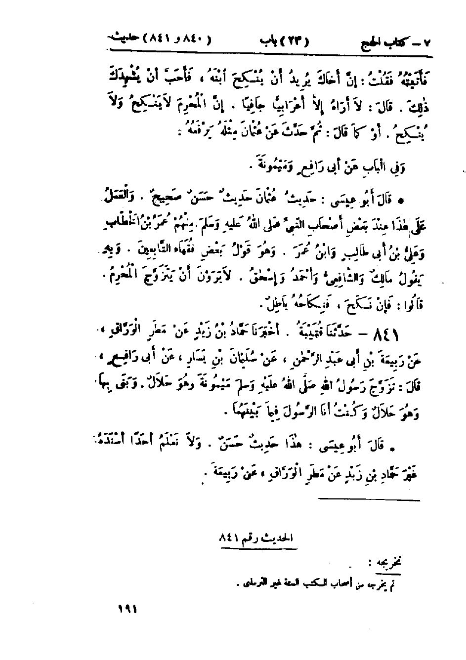 841 - حَدَّثَنَا قُتَيْبَةُ قَالَ: أَخْبَرَنَا حَمَّادُ بْنُ زَيْدٍ، عَنْ مَطَرٍ الوَرَّاقِ، عَنْ رَبِيعَةَ بْنِ أَبِي عَبْدِ الرَّحْمَنِ، عَنْ سُلَيْمَانَ بْنِ يَسَارٍ، عَنْ أَبِي رَافِعٍ قَالَ: «§تَزَوَّجَ رَسُولُ اللَّهِ صَلَّى اللَّهُ عَلَيْهِ وَسَلَّمَ مَيْمُونَةَ وَهُوَ حَلَالٌ، وَبَنَى بِهَا وَهُوَ حَلَالٌ»، وَكُنْتُ أَنَا الرَّسُولَ فِيمَا بَيْنَهُمَا: «هَذَا حَدِيثٌ حَسَنٌ، وَلَا نَعْلَمُ أَحَدًا أَسْنَدَهُ غَيْرَ حَمَّادِ بْنِ زَيْدٍ، عَنْ مَطَرٍ الوَرَّاقِ، عَنْ رَبِيعَةَ»، -[192]- وَرَوَى مَالِكُ بْنُ أَنَسٍ، عَنْ رَبِيعَةَ، عَنْ سُلَيْمَانَ بْنِ يَسَارٍ، «أَنَّ النَّبِيَّ صَلَّى اللَّهُ عَلَيْهِ وَسَلَّمَ تَزَوَّجَ مَيْمُونَةَ وَهُوَ حَلَالٌ»، رَوَاهُ مَالِكٌ مُرْسَلًا، وَرَوَاهُ أَيْضًا سُلَيْمَانُ بْنُ بِلَالٍ، عَنْ رَبِيعَةَ مُرْسَلًا.: وَرُوِي عَنْ يَزِيدَ بْنِ الأَصَمِّ، عَنْ مَيْمُونَةَ قَالَتْ: «تَزَوَّجَنِي رَسُولُ اللَّهِ صَلَّى اللَّهُ عَلَيْهِ وَسَلَّمَ وَهُوَ حَلَالٌ» وَرَوَى بَعْضُهُمْ عَنْ يَزِيدَ بْنِ الْأَصَمِّ أَنَّ النَّبِيَّ صَلَّى اللَّهُ عَلَيْهِ وَسَلَّمَ تَزَوَّجَ مَيْمُونَةَ وَهُوَ حَلَالٌ. وَيَزِيدُ بْنُ الْأَصَمِّ هُوَ ابْنُ أُخْتِ مَيْمُونَةَ