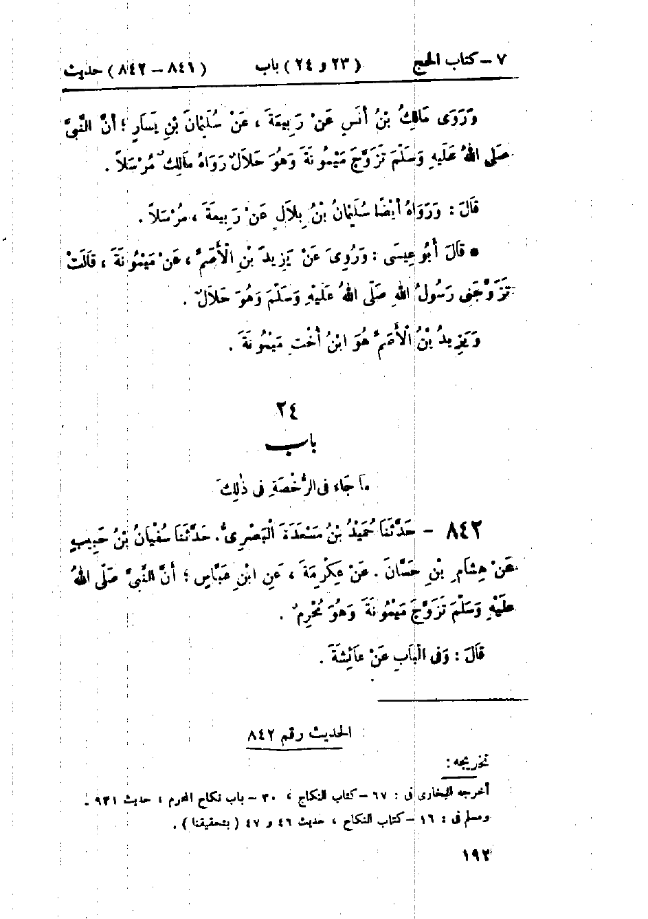 842 - حَدَّثَنَا حُمَيْدُ بْنُ مَسْعَدَةَ قَالَ: حَدَّثَنَا سُفْيَانُ بْنُ حَبِيبٍ، عَنْ هِشَامِ بْنِ حَسَّانَ، عَنْ عِكْرِمَةَ، عَنْ ابْنِ عَبَّاسٍ، «أَنَّ النَّبِيَّ صَلَّى اللَّهُ عَلَيْهِ وَسَلَّمَ §تَزَوَّجَ مَيْمُونَةَ وَهُوَ مُحْرِمٌ» وَفِي البَابِ عَنْ عَائِشَةَ. -[193]- حَدِيثُ ابْنِ عَبَّاسٍ حَدِيثٌ حَسَنٌ صَحِيحٌ، وَالعَمَلُ عَلَى هَذَا عِنْدَ بَعْضِ أَهْلِ العِلْمِ، وَبِهِ يَقُولُ سُفْيَانُ الثَّوْرِيُّ، وَأَهْلُ الكُوفَةِ