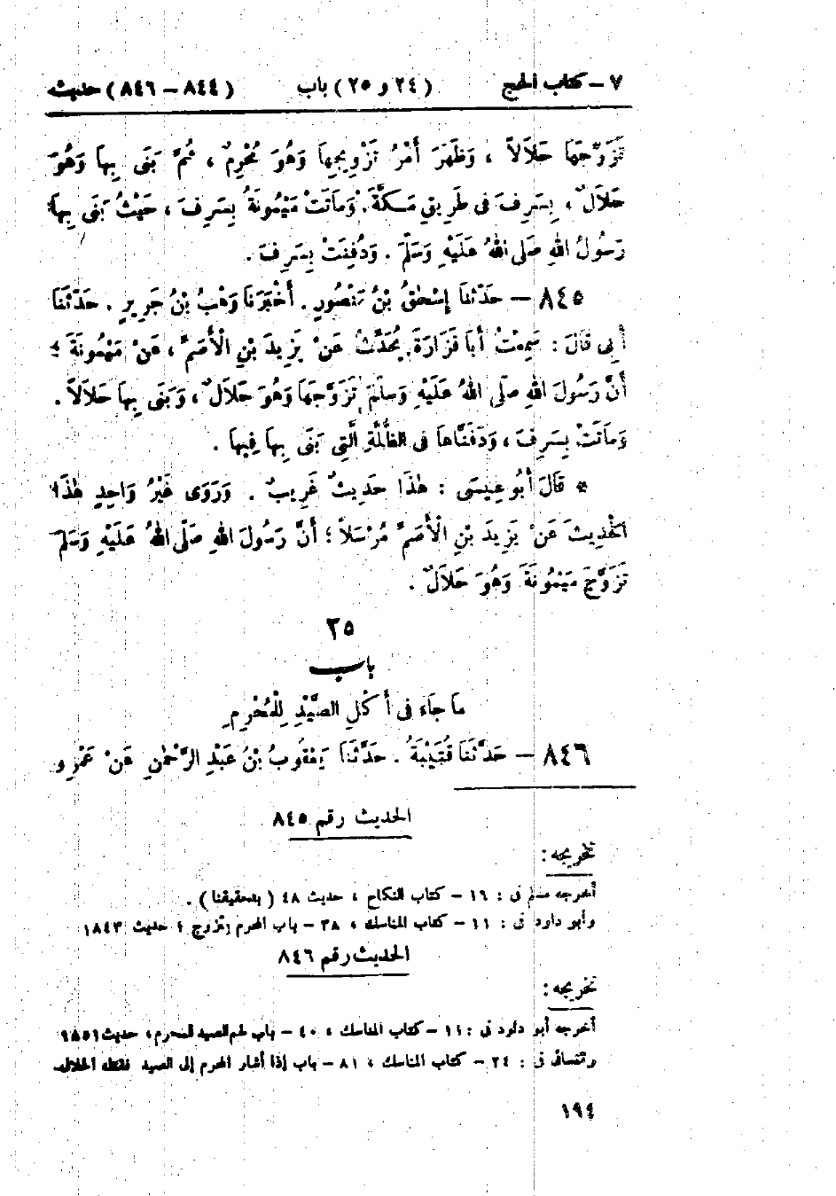 845 - حَدَّثَنَا إِسْحَاقُ بْنُ مَنْصُورٍ قَالَ: أَخْبَرَنَا وَهْبُ بْنُ جَرِيرٍ قَالَ: حَدَّثَنَا أَبِي قَالَ: سَمِعْتُ أَبَا فَزَارَةَ، يُحَدِّثُ عَنْ يَزِيدَ بْنِ الأَصَمِّ، عَنْ مَيْمُونَةَ، «أَنَّ رَسُولَ اللَّهِ صَلَّى اللَّهُ عَلَيْهِ وَسَلَّمَ §تَزَوَّجَهَا وَهُوَ حَلَالٌ، وَبَنَى بِهَا حَلَالًا، وَمَاتَتْ بِسَرِفَ، وَدَفَنَّاهَا فِي الظُّلَّةِ الَّتِي بَنَى بِهَا فِيهَا»: «هَذَا حَدِيثٌ غَرِيبٌ» وَرَوَى غَيْرُ وَاحِدٍ هَذَا الحَدِيثَ عَنْ يَزِيدَ بْنِ الأَصَمِّ مُرْسَلًا، «أَنَّ رَسُولَ اللَّهِ صَلَّى اللَّهُ عَلَيْهِ وَسَلَّمَ تَزَوَّجَ مَيْمُونَةَ وَهُوَ حَلَالٌ»