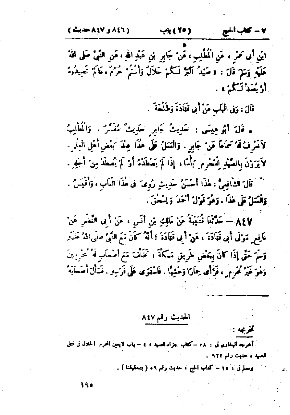 847 - حَدَّثَنَا قُتَيْبَةُ، عَنْ مَالِكِ بْنِ أَنَسٍ، عَنْ أَبِي النَّضْرِ، عَنْ نَافِعٍ، مَوْلَى أَبِي قَتَادَةَ، عَنْ أَبِي قَتَادَةَ، أَنَّهُ كَانَ مَعَ النَّبِيِّ صَلَّى اللَّهُ عَلَيْهِ وَسَلَّمَ حَتَّى إِذَا كَانَ بِبَعْضِ طَرِيقِ مَكَّةَ تَخَلَّفَ مَعَ أَصْحَابٍ لَهُ مُحْرِمِينَ، وَهُوَ غَيْرُ مُحْرِمٍ، فَرَأَى حِمَارًا وَحْشِيًّا، فَاسْتَوَى عَلَى فَرَسِهِ، فَسَأَلَ أَصْحَابَهُ -[196]- أَنْ يُنَاوِلُوهُ سَوْطَهُ، فَأَبَوْا، فَسَأَلَهُمْ رُمْحَهُ، فَأَبَوْا عَلَيْهِ، فَأَخَذَهُ، ثُمَّ شَدَّ عَلَى الحِمَارِ، فَقَتَلَهُ فَأَكَلَ مِنْهُ بَعْضُ أَصْحَابِ النَّبِيِّ صَلَّى اللَّهُ عَلَيْهِ وَسَلَّمَ وَأَبَى بَعْضُهُمْ، فَأَدْرَكُوا النَّبِيَّ صَلَّى اللَّهُ عَلَيْهِ وَسَلَّمَ، فَسَأَلُوهُ عَنْ ذَلِكَ، فَقَالَ: «§إِنَّمَا هِيَ طُعْمَةٌ أَطْعَمَكُمُوهَا اللَّهُ» هَذَا حَدِيثٌ حَسَنٌ صَحِيحٌ.