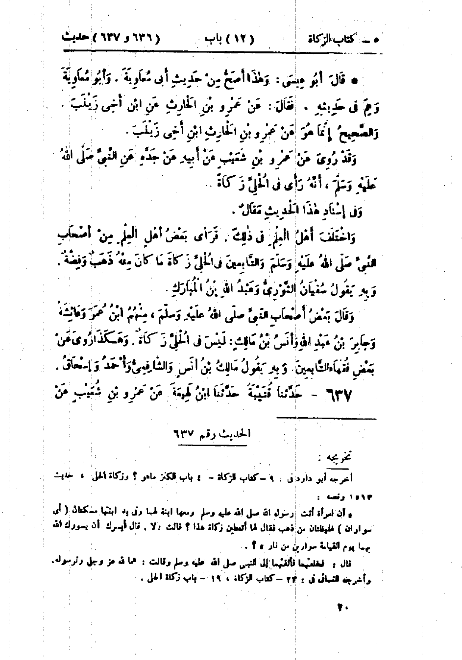 637 - حَدَّثَنَا قُتَيْبَةُ قَالَ: حَدَّثَنَا ابْنُ لَهِيعَةَ، عَنْ عَمْرِو بْنِ شُعَيْبٍ، عَنْ -[21]- أَبِيهِ، عَنْ جَدِّهِ، أَنَّ امْرَأَتَيْنِ أَتَتَا رَسُولَ اللَّهِ صَلَّى اللَّهُ عَلَيْهِ وَسَلَّمَ وَفِي أَيْدِيهِمَا سُوَارَانِ مِنْ ذَهَبٍ، فَقَالَ لَهُمَا: «§أَتُؤَدِّيَانِ زَكَاتَهُ؟»، قَالَتَا: لَا، قَالَ: فَقَالَ لَهُمَا رَسُولُ اللَّهِ صَلَّى اللَّهُ عَلَيْهِ وَسَلَّمَ: «أَتُحِبَّانِ أَنْ يُسَوِّرَكُمَا اللَّهُ بِسُوَارَيْنِ مِنْ نَارٍ؟»، قَالَتَا: لَا، قَالَ: «فَأَدِّيَا زَكَاتَهُ»: وَهَذَا حَدِيثٌ قَدْ رَوَاهُ المُثَنَّى بْنُ الصَّبَّاحِ، عَنْ عَمْرِو بْنِ شُعَيْبٍ، نَحْوَ هَذَا، «وَالمُثَنَّى بْنُ الصَّبَّاحِ وَابْنُ لَهِيعَةَ يُضَعَّفَانِ فِي الحَدِيثِ، وَلَا يَصِحُّ فِي هَذَا البَابِ عَنِ النَّبِيِّ صَلَّى اللَّهُ عَلَيْهِ وَسَلَّمَ شَيْءٌ»