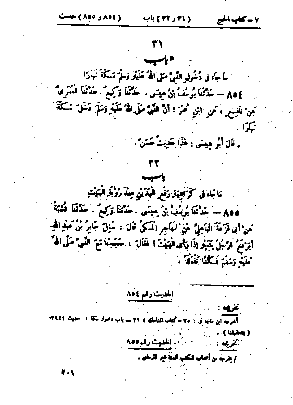 854 - حَدَّثَنَا يُوسُفُ بْنُ عِيسَى قَالَ: حَدَّثَنَا وَكِيعٌ قَالَ: حَدَّثَنَا العُمَرِيُّ، عَنْ نَافِعٍ، عَنْ ابْنِ عُمَرَ، «أَنَّ النَّبِيَّ صَلَّى اللَّهُ عَلَيْهِ وَسَلَّمَ §دَخَلَ مَكَّةَ نَهَارًا»: «هَذَا حَدِيثٌ حَسَنٌ»