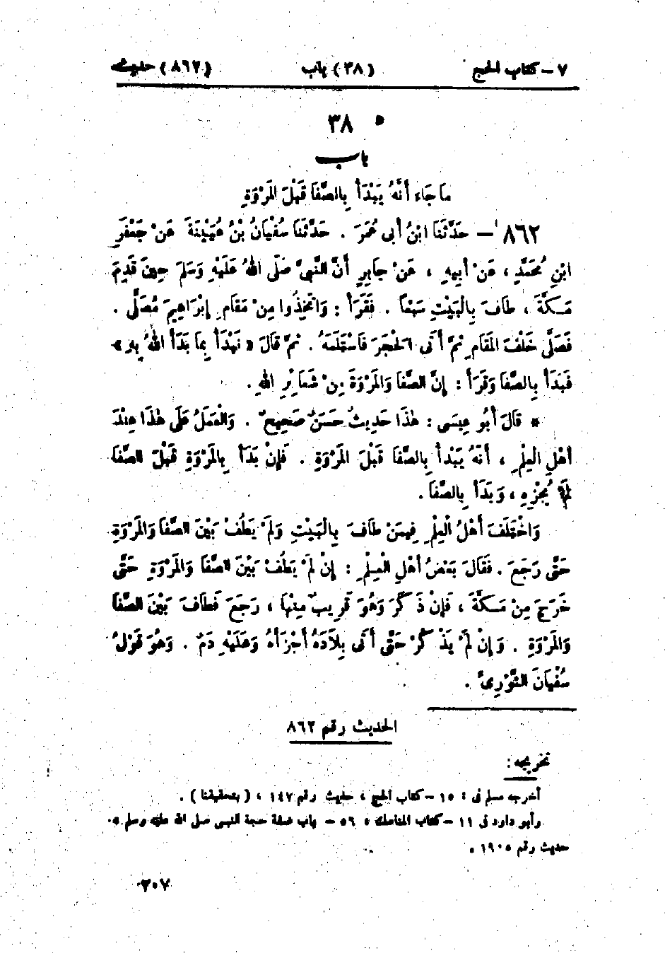 862 - حَدَّثَنَا ابْنُ أَبِي عُمَرَ قَالَ: حَدَّثَنَا سُفْيَانُ بْنُ عُيَيْنَةَ، عَنْ جَعْفَرِ بْنِ مُحَمَّدٍ، عَنْ أَبِيهِ، عَنْ جَابِرٍ، أَنَّ النَّبِيَّ صَلَّى اللَّهُ عَلَيْهِ وَسَلَّمَ حِينَ قَدِمَ مَكَّةَ طَافَ بِالبَيْتِ سَبْعًا، فَقَرَأَ: {وَاتَّخِذُوا مِنْ مَقَامِ إِبْرَاهِيمَ مُصَلًّى} [البقرة: 125]، فَصَلَّى خَلْفَ المَقَامِ، ثُمَّ أَتَى الحَجَرَ فَاسْتَلَمَهُ، ثُمَّ قَالَ: «§نَبْدَأُ بِمَا بَدَأَ اللَّهُ بِهِ»، فَبَدَأَ بِالصَّفَا، وَقَرَأَ: {إِنَّ الصَّفَا وَالمَرْوَةَ مِنْ شَعَائِرِ اللَّهِ} [البقرة: 158]: «هَذَا حَدِيثٌ حَسَنٌ صَحِيحٌ، وَالعَمَلُ عَلَى هَذَا عِنْدَ أَهْلِ العِلْمِ أَنَّهُ يَبْدَأُ بِالصَّفَا قَبْلَ المَرْوَةِ، فَإِنْ بَدَأَ بِالمَرْوَةِ قَبْلَ الصَّفَا لَمْ يُجْزِهِ، وَبَدَأَ بِالصَّفَا، وَاخْتَلَفَ أَهْلُ العِلْمِ فِيمَنْ طَافَ بِالبَيْتِ وَلَمْ يَطُفْ بَيْنَ الصَّفَا وَالمَرْوَةِ حَتَّى رَجَعَ»، " فَقَالَ بَعْضُ أَهْلِ العِلْمِ: إِنْ لَمْ يَطُفْ بَيْنَ الصَّفَا وَالمَرْوَةِ حَتَّى خَرَجَ مِنْ مَكَّةَ فَإِنْ ذَكَرَ وَهُوَ قَرِيبٌ مِنْهَا رَجَعَ فَطَافَ بَيْنَ الصَّفَا وَالمَرْوَةِ، وَإِنْ لَمْ يَذْكُرْ حَتَّى أَتَى بِلَادَهُ أَجْزَأَهُ وَعَلَيْهِ دَمٌ، وَهُوَ قَوْلُ سُفْيَانَ الثَّوْرِيِّ «، -[208]-» وقَالَ بَعْضُهُمْ: إِنْ تَرَكَ الطَّوَافَ بَيْنَ الصَّفَا وَالمَرْوَةِ حَتَّى رَجَعَ إِلَى بِلَادِهِ، فَإِنَّهُ لَا يُجْزِيهِ "، وَهُوَ قَوْلُ الشَّافِعِيِّ قَالَ: «الطَّوَافُ بَيْنَ الصَّفَا وَالمَرْوَةِ وَاجِبٌ لَا يَجُوزُ الحَجُّ إِلَّا بِهِ»