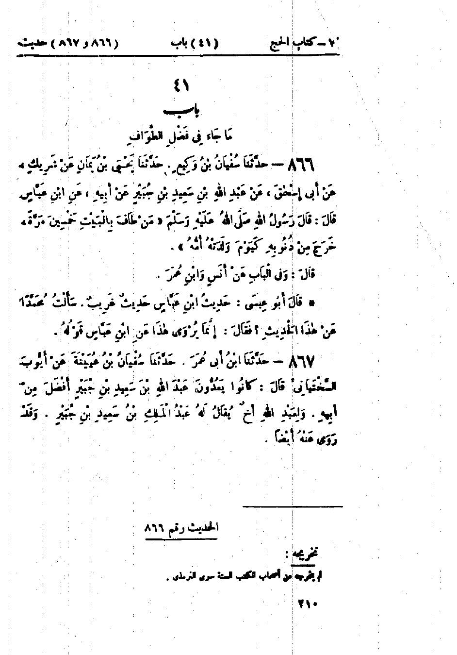 866 - حَدَّثَنَا سُفْيَانُ بْنُ وَكِيعٍ قَالَ: حَدَّثَنَا يَحْيَى بْنُ يَمَانٍ، عَنْ شَرِيكٍ، عَنْ أَبِي إِسْحَاقَ، عَنْ عَبْدِ اللَّهِ بْنِ سَعِيدِ بْنِ جُبَيْرٍ، عَنْ أَبِيهِ، عَنْ ابْنِ عَبَّاسٍ قَالَ: قَالَ رَسُولُ اللَّهِ صَلَّى اللَّهُ عَلَيْهِ وَسَلَّمَ: «§مَنْ طَافَ بِالبَيْتِ خَمْسِينَ مَرَّةً خَرَجَ مِنْ ذُنُوبِهِ كَيَوْمِ وَلَدَتْهُ أُمُّهُ» وَفِي البَابِ عَنْ أَنَسٍ، وَابْنِ عُمَرَ.: «حَدِيثُ ابْنِ عَبَّاسٍ حَدِيثٌ غَرِيبٌ» سَأَلْتُ مُحَمَّدًا عَنْ هَذَا الحَدِيثِ، فَقَالَ: «إِنَّمَا يُرْوَى هَذَا عَنْ ابْنِ عَبَّاسٍ قَوْلُهُ»،