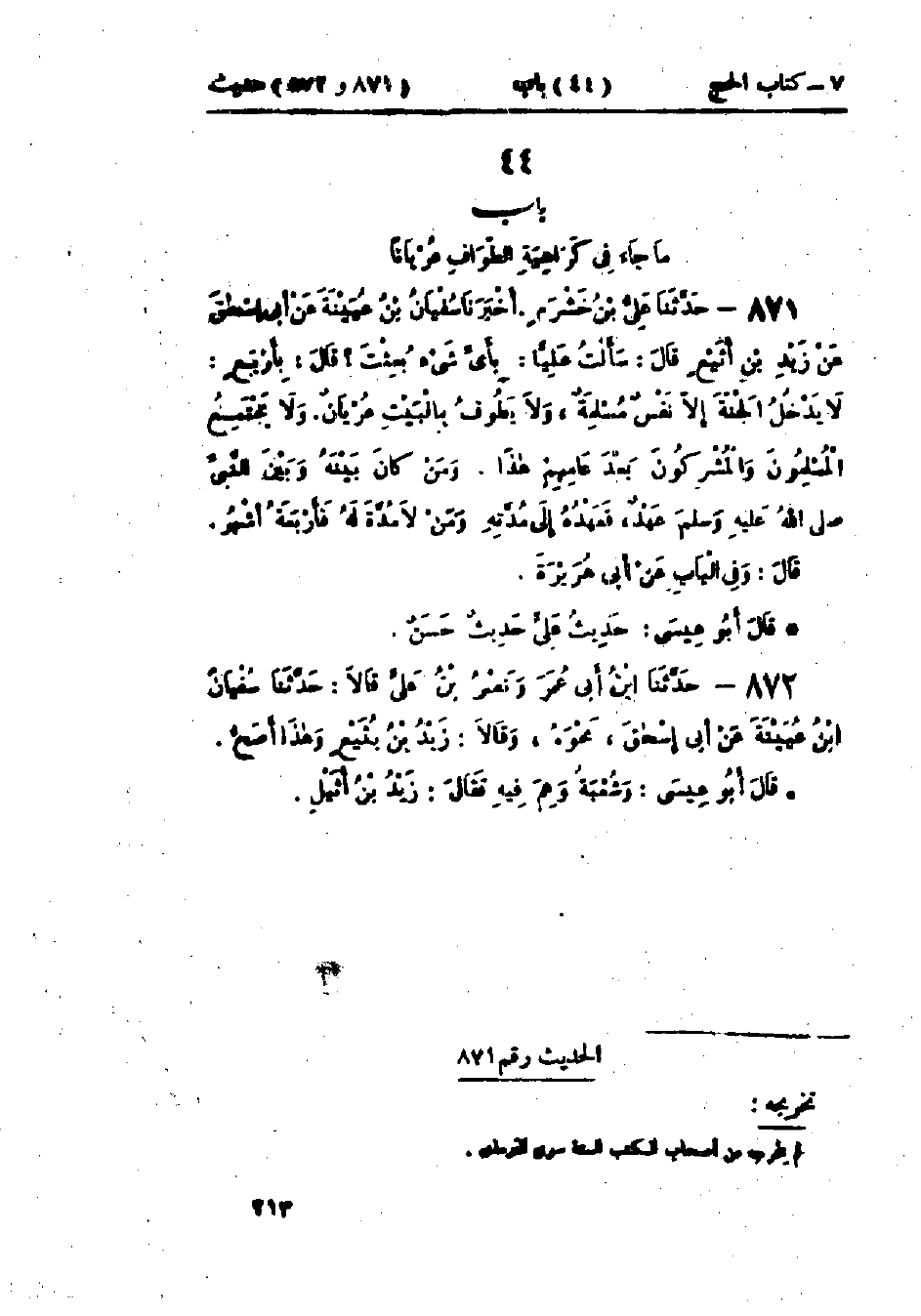 871 - حَدَّثَنَا عَلِيُّ بْنُ خَشْرَمٍ قَالَ: أَخْبَرَنَا سُفْيَانُ بْنُ عُيَيْنَةَ، عَنْ أَبِي إِسْحَاقَ، عَنْ زَيْدِ بْنِ أُثَيْعٍ، قَالَ: سَأَلْتُ عَلِيًّا بِأَيِّ شَيْءٍ بُعِثْتَ؟ قَالَ: " بِأَرْبَعٍ: §لَا يَدْخُلُ الجَنَّةَ إِلَّا نَفْسٌ مُسْلِمَةٌ، وَلَا يَطُوفُ بِالبَيْتِ عُرْيَانٌ، وَلَا يَجْتَمِعُ المُسْلِمُونَ وَالمُشْرِكُونَ بَعْدَ عَامِهِمْ هَذَا، وَمَنْ كَانَ بَيْنَهُ وَبَيْنَ النَّبِيِّ صَلَّى اللَّهُ عَلَيْهِ وَسَلَّمَ عَهْدٌ فَعَهْدُهُ إِلَى مُدَّتِهِ، وَمَنْ لَا مُدَّةَ لَهُ فَأَرْبَعَةُ أَشْهُرٍ " وَفِي البَابِ عَنْ أَبِي هُرَيْرَةَ.: «حَدِيثُ عَلِيٍّ حَدِيثٌ حَسَنٌ صَحِيحٌ».