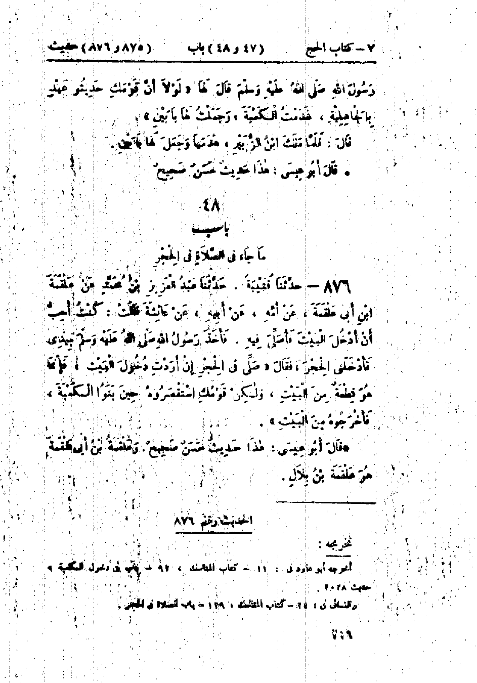 876 - حَدَّثَنَا قُتَيْبَةُ قَالَ: حَدَّثَنَا عَبْدُ العَزِيزِ بْنُ مُحَمَّدٍ، عَنْ عَلْقَمَةَ بْنِ أَبِي عَلْقَمَةَ، عَنْ أُمِّهِ، عَنْ عَائِشَةَ قَالَتْ: كُنْتُ أُحِبُّ أَنْ أَدْخُلَ البَيْتَ فَأُصَلِّيَ فِيهِ، فَأَخَذَ رَسُولُ اللَّهِ صَلَّى اللَّهُ عَلَيْهِ وَسَلَّمَ بِيَدِي فَأَدْخَلَنِي الحِجْرَ، فَقَالَ: «§صَلِّي فِي الحِجْرِ إِنْ أَرَدْتِ دُخُولَ البَيْتِ، فَإِنَّمَا هُوَ قِطْعَةٌ مِنَ البَيْتِ، وَلَكِنَّ قَوْمَكِ اسْتَقْصَرُوهُ حِينَ بَنَوْا الكَعْبَةَ فَأَخْرَجُوهُ مِنَ البَيْتِ»: «هَذَا حَدِيثٌ حَسَنٌ صَحِيحٌ» وَعَلْقَمَةُ بْنُ أَبِي عَلْقَمَةَ هُوَ عَلْقَمَةُ بْنُ بِلَالٍ "