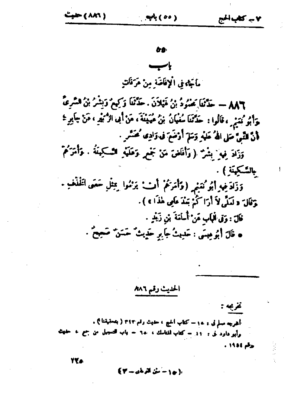 886 - حَدَّثَنَا مَحْمُودُ بْنُ غَيْلَانَ قَالَ: حَدَّثَنَا وَكِيعٌ، وَبِشْرُ بْنُ السَّرِيِّ، وَأَبُو نُعَيْمٍ قَالُوا: حَدَّثَنَا سُفْيَانُ الثَّوْرِيُّ، عَنْ أَبِي الزُّبَيْرِ، عَنْ جَابِرٍ، أَنَّ النَّبِيَّ صَلَّى اللَّهُ عَلَيْهِ وَسَلَّمَ أَوْضَعَ فِي وَادِي مُحَسِّرٍ - وَزَادَ فِيهِ بِشْرٌ: - وَأَفَاضَ مِنْ جَمْعٍ وَعَلَيْهِ السَّكِينَةُ وَأَمَرَهُمْ بِالسَّكِينَةِ، - وَزَادَ فِيهِ أَبُو نُعَيْمٍ: - وَأَمَرَهُمْ أَنْ يَرْمُوا بِمِثْلِ حَصَى الخَذْفِ، وَقَالَ: «§لَعَلِّي لَا أَرَاكُمْ بَعْدَ عَامِي هَذَا» وَفِي البَابِ عَنْ أُسَامَةَ بْنِ زَيْدٍ.: «حَدِيثُ جَابِرٍ حَدِيثٌ حَسَنٌ صَحِيحٌ»