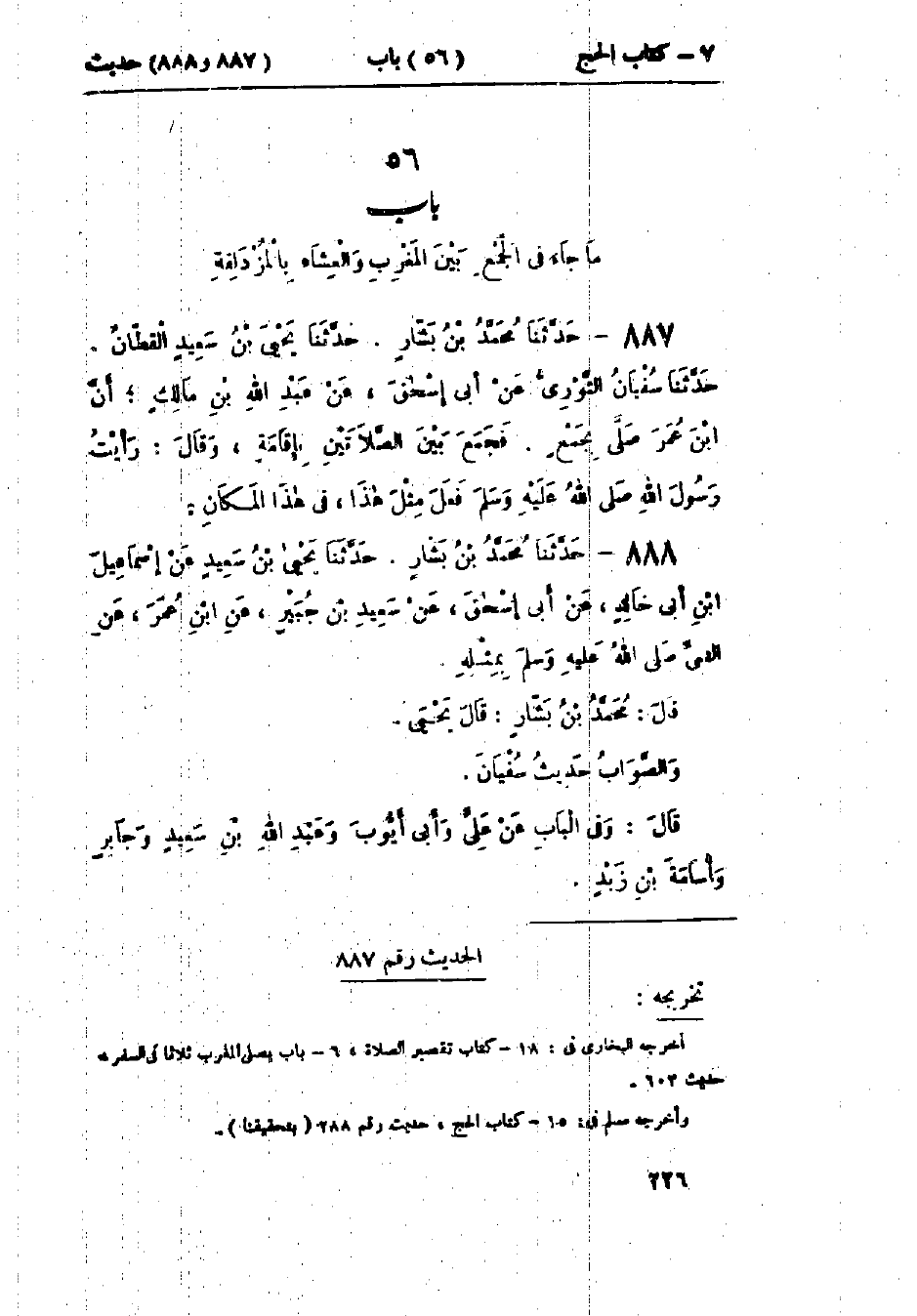 888 - حَدَّثَنَا مُحَمَّدُ بْنُ بَشَّارٍ قَالَ: حَدَّثَنَا يَحْيَى بْنُ سَعِيدٍ، عَنْ إِسْمَاعِيلَ بْنِ أَبِي خَالِدٍ، عَنْ أَبِي إِسْحَاقَ، عَنْ سَعِيدِ بْنِ جُبَيْرٍ، عَنْ ابْنِ عُمَرَ، عَنِ النَّبِيِّ صَلَّى اللَّهُ عَلَيْهِ وَسَلَّمَ بِمِثْلِهِ. قَالَ مُحَمَّدُ بْنُ بَشَّارٍ: قَالَ يَحْيَى: «وَالصَّوَابُ حَدِيثُ سُفْيَانَ». وَفِي البَابِ عَنْ عَلِيٍّ، وَأَبِي أَيُّوبَ، وَعَبْدِ اللَّهِ بْنِ مَسْعُودٍ، وَجَابِرٍ، وَأُسَامَةَ بْنِ زَيْدٍ.: -[227]- «حَدِيثُ ابْنُ عُمَرَ فِي رِوَايَةِ سُفْيَانَ أَصَحُّ مِنْ رِوَايَةِ إِسْمَاعِيلَ بْنِ أَبِي خَالِدٍ، وَحَدِيثُ سُفْيَانَ حَدِيثٌ حَسَنٌ صَحِيحٌ» وَالعَمَلُ عَلَى هَذَا عِنْدَ أَهْلِ العِلْمِ لِأَنَّهُ لَا تُصَلَّى صَلَاةُ المَغْرِبِ دُونَ جَمْعٍ، فَإِذَا أَتَى جَمْعًا وَهُوَ المُزْدَلِفَةُ جَمَعَ بَيْنَ الصَّلَاتَيْنِ بِإِقَامَةٍ وَاحِدَةٍ، وَلَمْ يَتَطَوَّعْ فِيمَا بَيْنَهُمَا، وَهُوَ الَّذِي اخْتَارَهُ بَعْضُ أَهْلِ العِلْمِ، وَذَهَبَ إِلَيْهِ، وَهُوَ قَوْلُ سُفْيَانَ الثَّوْرِيِّ " قَالَ سُفْيَانُ: «وَإِنْ شَاءَ صَلَّى المَغْرِبَ، ثُمَّ تَعَشَّى وَوَضَعَ ثِيَابَهُ، ثُمَّ أَقَامَ فَصَلَّى العِشَاءَ» وَقَالَ بَعْضُ أَهْلِ العِلْمِ: يَجْمَعُ بَيْنَ المَغْرِبِ وَالعِشَاءِ بِالمُزْدَلِفَةِ بِأَذَانٍ وَإِقَامَتَيْنِ، يُؤَذِّنُ لِصَلَاةِ المَغْرِبِ وَيُقِيمُ، وَيُصَلِّي المَغْرِبَ ثُمَّ يُقِيمُ وَيُصَلِّي العِشَاءَ، وَهُوَ قَوْلُ الشَّافِعِيِّ ".: وَرَوَى إِسْرَائِيلُ هَذَا الحَدِيثَ، عَنْ أَبِي إِسْحَاقَ، عَنْ عَبْدِ اللَّهِ، وَخَالِدٍ ابْنَيْ مَالِكٍ، عَنْ ابْنِ عُمَرَ، «وَحَدِيثُ سَعِيدِ بْنِ جُبَيْرٍ عَنْ ابْنِ عُمَرَ هُوَ حَدِيثٌ حَسَنٌ صَحِيحٌ أَيْضًا» رَوَاهُ سَلَمَةُ بْنُ كُهَيْلٍ، عَنْ سَعِيدِ بْنِ جُبَيْرٍ، وَأَمَّا أَبُو إِسْحَاقَ فَرَوَاهُ عَنْ عَبْدِ اللَّهِ وَخَالِدٍ ابْنَيْ مَالِكٍ، عَنْ ابْنِ عُمَرَ