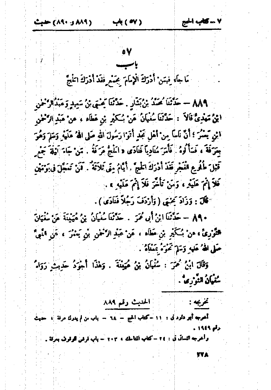 890 - حَدَّثَنَا ابْنُ أَبِي عُمَرَ قَالَ: حَدَّثَنَا سُفْيَانُ بْنُ عُيَيْنَةَ، عَنْ سُفْيَانَ الثَّوْرِيِّ، عَنْ بُكَيْرِ بْنِ عَطَاءٍ، عَنْ عَبْدِ الرَّحْمَنِ بْنِ يَعْمَرَ، عَنِ النَّبِيِّ صَلَّى اللَّهُ عَلَيْهِ وَسَلَّمَ نَحْوَهُ بِمَعْنَاهُ، وقَالَ ابْنُ أَبِي عُمَرَ: قَالَ سُفْيَانُ بْنُ عُيَيْنَةَ: «وَهَذَا أَجْوَدُ حَدِيثٍ رَوَاهُ سُفْيَانُ الثَّوْرِيُّ».: -[229]- «وَالعَمَلُ عَلَى حَدِيثِ عَبْدِ الرَّحْمَنِ بْنِ يَعْمَرَ عِنْدَ أَهْلِ العِلْمِ مِنْ أَصْحَابِ النَّبِيِّ صَلَّى اللَّهُ عَلَيْهِ وَسَلَّمَ وَغَيْرِهِمْ أَنَّهُ مَنْ لَمْ يَقِفْ بِعَرَفَاتٍ قَبْلَ طُلُوعِ الفَجْرِ فَقَدْ فَاتَهُ الحَجُّ وَلَا يُجْزِئُ عَنْهُ إِنْ جَاءَ بَعْدَ طُلُوعِ الفَجْرِ وَيَجْعَلُهَا عُمْرَةً، وَعَلَيْهِ الحَجُّ مِنْ قَابِلٍ وَهُوَ قَوْلُ الثَّوْرِيِّ، وَالشَّافِعِيِّ، وَأَحْمَدَ، وَإِسْحَاقَ».: «وَقَدْ رَوَى شُعْبَةُ، عَنْ بُكَيْرِ بْنِ عَطَاءٍ نَحْوَ حَدِيثِ الثَّوْرِيِّ». قَالَ: وَسَمِعْتُ الجَارُودَ يَقُولُ: سَمِعْتُ وَكِيعًا أَنَّهُ ذَكَرَ هَذَا الحَدِيثَ، فَقَالَ: «هَذَا الحَدِيثُ أُمُّ المَنَاسِكِ»