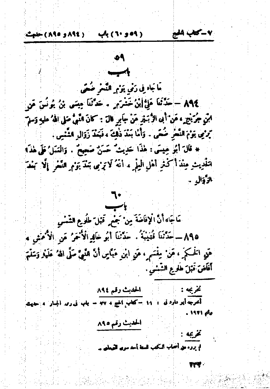 894 - حَدَّثَنَا عَلِيُّ بْنُ خَشْرَمٍ قَالَ: حَدَّثَنَا عِيسَى بْنُ يُونُسَ، عَنْ ابْنِ جُرَيْجٍ، عَنْ أَبِي الزُّبَيْرِ، عَنْ جَابِرٍ قَالَ: «كَانَ النَّبِيُّ صَلَّى اللَّهُ عَلَيْهِ وَسَلَّمَ §يَرْمِي يَوْمَ النَّحْرِ ضُحًى، وَأَمَّا بَعْدَ ذَلِكَ، فَبَعْدَ زَوَالِ الشَّمْسِ»: «هَذَا حَدِيثٌ حَسَنٌ صَحِيحٌ» وَالعَمَلُ عَلَى هَذَا الحَدِيثِ عِنْدَ أَكْثَرِ أَهْلِ العِلْمِ أَنَّهُ لَا يَرْمِي بَعْدَ يَوْمِ النَّحْرِ إِلَّا بَعْدَ الزَّوَالِ "