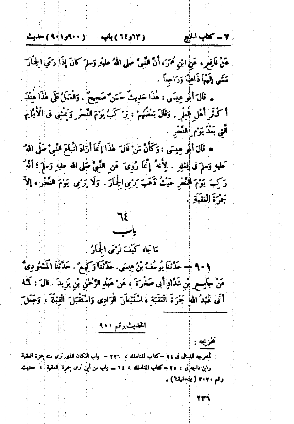 901 - حَدَّثَنَا يُوسُفُ بْنُ عِيسَى قَالَ: حَدَّثَنَا وَكِيعٌ قَالَ: حَدَّثَنَا المَسْعُودِيُّ، عَنْ جَامِعِ بْنِ شَدَّادٍ أَبِي صَخْرَةَ، عَنْ عَبْدِ الرَّحْمَنِ بْنِ يَزِيدَ، قَالَ: لَمَّا أَتَى عَبْدُ اللَّهِ جَمْرَةَ العَقَبَةِ اسْتَبْطَنَ الوَادِيَ، وَاسْتَقْبَلَ القِبْلَةَ، وَجَعَلَ -[237]- يَرْمِي الجَمْرَةَ عَلَى حَاجِبِهِ الأَيْمَنِ، ثُمَّ رَمَى بِسَبْعِ حَصَيَاتٍ يُكَبِّرُ مَعَ كُلِّ حَصَاةٍ، ثُمَّ قَالَ: «وَاللَّهِ الَّذِي لَا إِلَهَ إِلَّا هُوَ، §مِنْ هَاهُنَا رَمَى الَّذِي أُنْزِلَتْ عَلَيْهِ سُورَةُ البَقَرَةِ» حَدَّثَنَا هَنَّادٌ قَالَ: حَدَّثَنَا وَكِيعٌ، عَنِ المَسْعُودِيِّ بِهَذَا الإِسْنَادِ نَحْوَهُ. وَفِي البَابِ عَنْ الفَضْلِ بْنِ عَبَّاسٍ، وَابْنِ عَبَّاسٍ، وَابْنِ عُمَرَ، وجَابِرٍ.: «حَدِيثُ ابْنِ مَسْعُودٍ حَدِيثٌ حَسَنٌ صَحِيحٌ»، «وَالعَمَلُ عَلَى هَذَا عِنْدَ أَهْلِ العِلْمِ يَخْتَارُونَ أَنْ يَرْمِيَ الرَّجُلُ مِنْ بَطْنِ الوَادِي بِسَبْعِ حَصَيَاتٍ يُكَبِّرُ مَعَ كُلِّ حَصَاةٍ، وَقَدْ رَخَّصَ بَعْضُ أَهْلِ العِلْمِ إِنْ لَمْ يُمْكِنْهُ أَنْ يَرْمِيَ مِنْ بَطْنِ الوَادِي رَمَى مِنْ حَيْثُ قَدَرَ عَلَيْهِ، وَإِنْ لَمْ يَكُنْ فِي بَطْنِ الوَادِي»