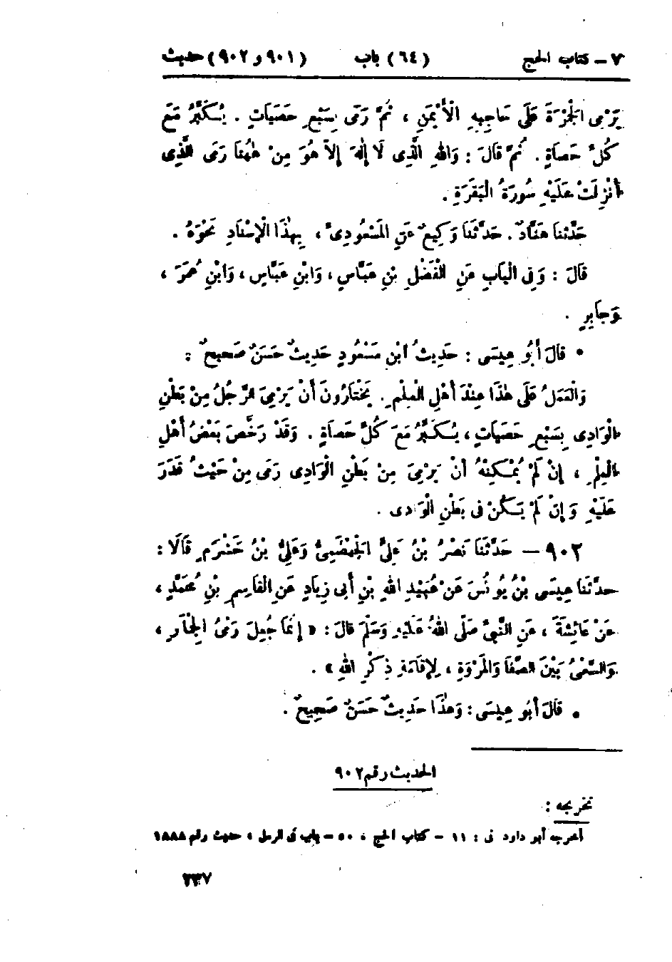 902 - حَدَّثَنَا نَصْرُ بْنُ عَلِيٍّ الجَهْضَمِيُّ، وَعَلِيُّ بْنُ خَشْرَمٍ، قَالَا: حَدَّثَنَا عِيسَى بْنُ يُونُسَ، عَنْ عُبَيْدِ اللَّهِ بْنِ أَبِي زِيَادٍ، عَنْ القَاسِمِ بْنِ مُحَمَّدٍ، عَنْ عَائِشَةَ، عَنْ النَّبِيِّ صَلَّى اللَّهُ عَلَيْهِ وَسَلَّمَ قَالَ: «إِنَّمَا §جُعِلَ رَمْيُ الجِمَارِ، وَالسَّعْيُ بَيْنَ الصَّفَا وَالمَرْوَةِ لِإِقَامَةِ ذِكْرِ اللَّهِ»: «وَهَذَا حَدِيثٌ حَسَنٌ صَحِيحٌ»