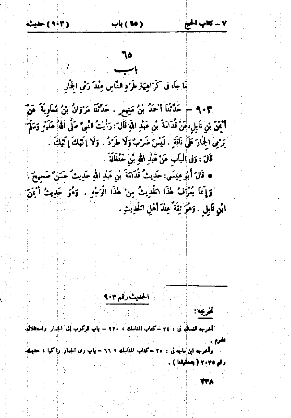 903 - حَدَّثَنَا أَحْمَدُ بْنُ مَنِيعٍ قَالَ: حَدَّثَنَا مَرْوَانُ بْنُ مُعَاوِيَةَ، عَنْ أَيْمَنَ بْنِ نَابِلٍ، عَنْ قُدَامَةَ بْنِ عَبْدِ اللَّهِ قَالَ: «رَأَيْتُ النَّبِيَّ صَلَّى اللَّهُ عَلَيْهِ وَسَلَّمَ §يَرْمِي الجِمَارُ عَلَى نَاقَةٍ لَيْسَ ضَرْبٌ، وَلَا طَرْدٌ، وَلَا إِلَيْكَ إِلَيْكَ» وَفِي البَابِ عَنْ عَبْدِ اللَّهِ بْنِ حَنْظَلَةَ.: «حَدِيثُ قُدَامَةَ بْنِ عَبْدِ اللَّهِ حَدِيثٌ حَسَنٌ صَحِيحٌ، وَإِنَّمَا يُعْرَفُ هَذَا الحَدِيثُ مِنْ هَذَا الوَجْهِ، وَهُوَ حَدِيثُ أَيْمَنَ بْنِ نَابِلٍ وَهُوَ ثِقَةٌ عِنْدَ أَهْلِ الحَدِيثِ»