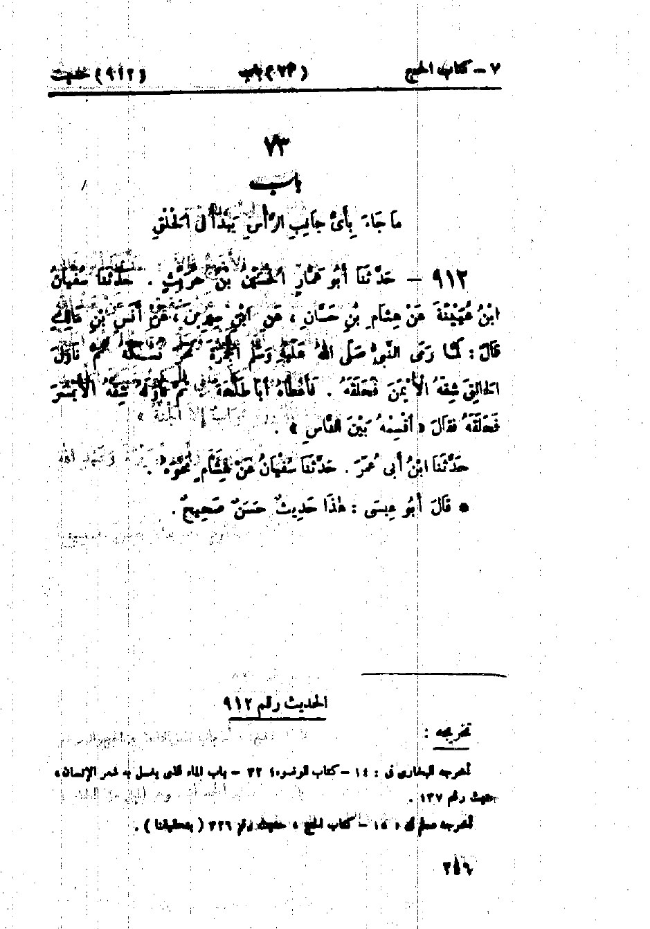 912 - حَدَّثَنَا أَبُو عَمَّارٍ الحُسَيْنُ بْنُ حُرَيْثٍ قَالَ: حَدَّثَنَا سُفْيَانُ بْنُ عُيَيْنَةَ، عَنْ هِشَامِ بْنِ حَسَّانَ، عَنْ ابْنِ سِيرِينَ، عَنْ أَنَسِ بْنِ مَالِكٍ قَالَ: لَمَّا رَمَى النَّبِيُّ صَلَّى اللَّهُ عَلَيْهِ وَسَلَّمَ الجَمْرَةَ نَحَرَ نُسُكَهُ، ثُمَّ نَاوَلَ الحَالِقَ شِقَّهُ الأَيْمَنَ فَحَلَقَهُ، فَأَعْطَاهُ أَبَا طَلْحَةَ، ثُمَّ نَاوَلَهُ شِقَّهُ الأَيْسَرَ فَحَلَقَهُ، فَقَالَ: «§اقْسِمْهُ بَيْنَ النَّاسِ» حَدَّثَنَا ابْنُ أَبِي عُمَرَ قَالَ: حَدَّثَنَا سُفْيَانُ، عَنْ هِشَامٍ نَحْوَهُ.: «هَذَا حَدِيثٌ حَسَنٌ»