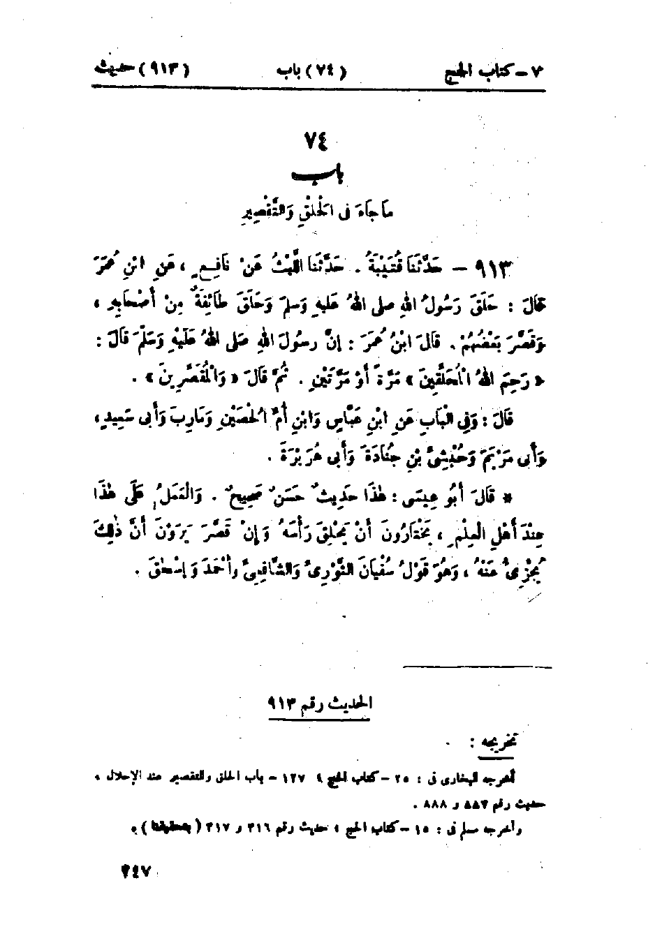 913 - حَدَّثَنَا قُتَيْبَةُ قَالَ: حَدَّثَنَا اللَّيْثُ، عَنْ نَافِعٍ، عَنْ ابْنِ عُمَرَ قَالَ: حَلَقَ رَسُولُ اللَّهِ صَلَّى اللَّهُ عَلَيْهِ وَسَلَّمَ، وَحَلَقَ طَائِفَةٌ مِنْ أَصْحَابِهِ، وَقَصَّرَ بَعْضُهُمْ، قَالَ ابْنُ عُمَرَ: إِنَّ رَسُولَ اللَّهِ صَلَّى اللَّهُ عَلَيْهِ وَسَلَّمَ قَالَ: «§رَحِمَ اللَّهُ المُحَلِّقِينَ مَرَّةً أَوْ مَرَّتَيْنِ»، ثُمَّ قَالَ: «وَالمُقَصِّرِينَ» وَفِي البَابِ عَنْ ابْنِ عَبَّاسٍ، وَابْنِ أُمِّ الحُصَيْنِ، وَمَارِبَ، وَأَبِي سَعِيدٍ، وَأَبِي مَرْيَمَ، وَحُبْشِيِّ بْنِ جُنَادَةَ، وَأَبِي هُرَيْرَةَ.: «هَذَا حَدِيثٌ حَسَنٌ صَحِيحٌ» وَالعَمَلُ عَلَى هَذَا عِنْدَ أَهْلِ العِلْمِ: يَخْتَارُونَ أَنْ يَحْلِقَ رَأْسَهُ، وَإِنْ قَصَّرَ يَرَوْنَ أَنَّ ذَلِكَ يُجْزِئُ عَنْهُ، وَهُوَ قَوْلُ سُفْيَانَ الثَّوْرِيِّ، وَالشَّافِعِيِّ، وَأَحْمَدَ، وَإِسْحَاقَ "