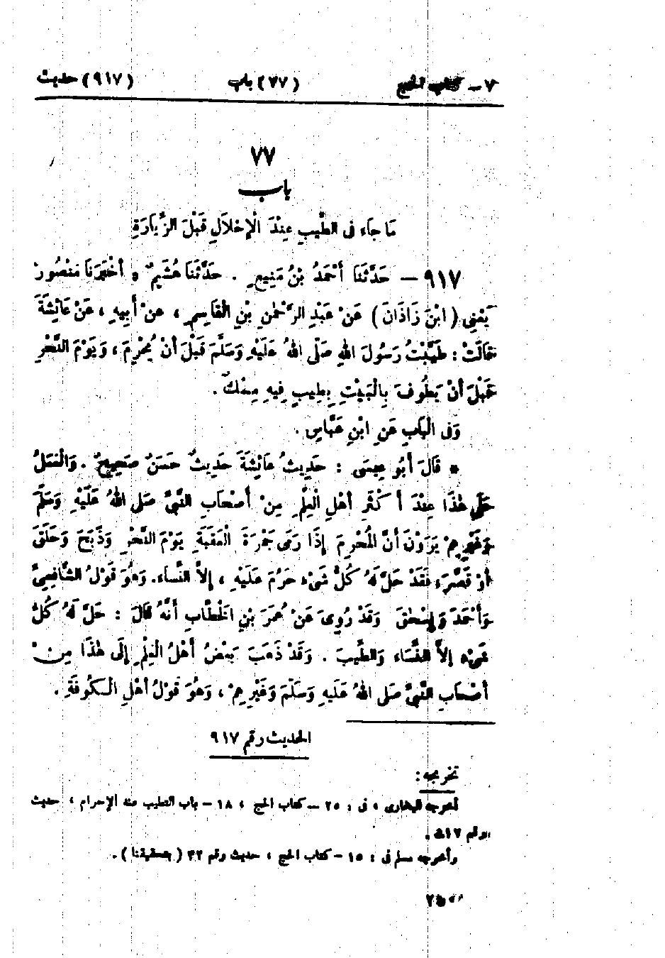 917 - حَدَّثَنَا أَحْمَدُ بْنُ مَنِيعٍ قَالَ: حَدَّثَنَا هُشَيْمٌ قَالَ: أَخْبَرَنَا مَنْصُورٌ يَعْنِي ابْنَ زَاذَانَ، عَنْ عَبْدِ الرَّحْمَنِ بْنِ القَاسِمِ، عَنْ أَبِيهِ، عَنْ عَائِشَةَ قَالَتْ: «§طَيَّبْتُ رَسُولَ اللَّهِ صَلَّى اللَّهُ عَلَيْهِ وَسَلَّمَ قَبْلَ أَنْ يُحْرِمَ، وَيَوْمَ النَّحْرِ قَبْلَ أَنْ يَطُوفَ بِالبَيْتِ، بِطِيبٍ فِيهِ مِسْكٌ» وَفِي البَابِ عَنْ ابْنِ عَبَّاسٍ. حَدِيثُ عَائِشَةَ حَدِيثٌ حَسَنٌ صَحِيحٌ، وَالعَمَلُ عَلَى هَذَا عِنْدَ أَكْثَرِ أَهْلِ العِلْمِ مِنْ أَصْحَابِ النَّبِيِّ صَلَّى اللَّهُ عَلَيْهِ وَسَلَّمَ وَغَيْرِهِمْ يَرَوْنَ: أَنَّ المُحْرِمَ إِذَا رَمَى جَمْرَةَ العَقَبَةِ يَوْمَ النَّحْرِ، وَذَبَحَ، وَحَلَقَ أَوْ قَصَّرَ، فَقَدْ حَلَّ لَهُ كُلُّ شَيْءٍ حَرُمَ عَلَيْهِ إِلَّا النِّسَاءَ، وَهُوَ قَوْلُ الشَّافِعِيِّ، وَأَحْمَدَ، وَإِسْحَاقَ، وَقَدْ رُوِيَ عَنْ عُمَرَ بْنِ الخَطَّابِ أَنَّهُ قَالَ: «حَلَّ لَهُ كُلُّ شَيْءٍ إِلَّا النِّسَاءَ وَالطِّيبَ»، وَقَدْ ذَهَبَ بَعْضُ أَهْلِ العِلْمِ إِلَى هَذَا مِنْ أَصْحَابِ النَّبِيِّ صَلَّى اللَّهُ عَلَيْهِ وَسَلَّمَ، وَغَيْرِهِمْ، وَهُوَ قَوْلُ أَهْلِ الكُوفَةِ