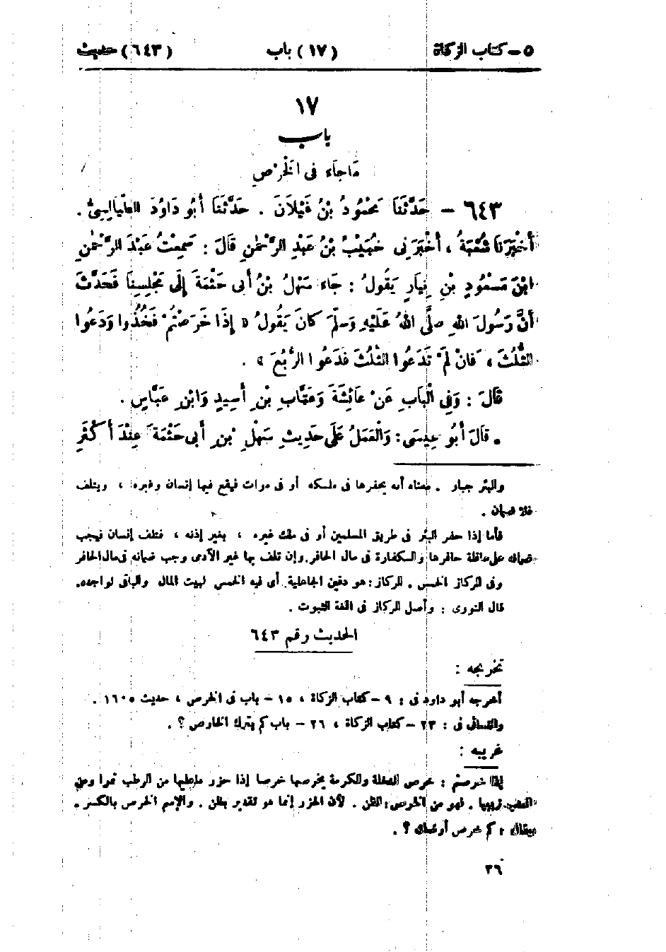643 - حَدَّثَنَا مَحْمُودُ بْنُ غَيْلَانَ قَالَ: حَدَّثَنَا أَبُو دَاوُدَ الطَّيَالِسِيُّ قَالَ: أَخْبَرَنَا شُعْبَةُ قَالَ: أَخْبَرَنِي خُبَيْبُ بْنُ عَبْدِ الرَّحْمَنِ، قَالَ: سَمِعْتُ عَبْدَ الرَّحْمَنِ بْنَ مَسْعُودِ بْنِ نِيَارٍ، يَقُولُ: جَاءَ سَهْلُ بْنُ أَبِي حَثْمَةَ إِلَى مَجْلِسِنَا فَحَدَّثَ، أَنَّ رَسُولَ اللَّهِ صَلَّى اللَّهُ عَلَيْهِ وَسَلَّمَ كَانَ يَقُولُ: «§إِذَا خَرَصْتُمْ فَخُذُوا وَدَعُوا الثُّلُثَ، فَإِنْ لَمْ تَدَعُوا الثُّلُثَ، فَدَعُوا الرُّبُعَ» وَفِي البَابِ عَنْ عَائِشَةَ، وَعَتَّابِ بْنِ أَسِيدٍ، وَابْنِ عَبَّاسٍ.: «وَالعَمَلُ عَلَى حَدِيثِ سَهْلِ بْنِ أَبِي حَثْمَةَ عِنْدَ أَكْثَرِ -[27]- أَهْلِ العِلْمِ فِي الخَرْصِ، وَبِحَدِيثِ سَهْلِ بْنِ أَبِي حَثْمَةَ، يَقُولُ أَحْمَدُ، وَإِسْحَاقُ»، " وَالخَرْصُ إِذَا أَدْرَكَتِ الثِّمَارُ مِنَ الرُّطَبِ وَالعِنَبِ مِمَّا فِيهِ الزَّكَاةُ بَعَثَ السُّلْطَانُ خَارِصًا يَخْرُصُ عَلَيْهِمْ، وَالخَرْصُ: أَنْ يَنْظُرَ مَنْ يُبْصِرُ ذَلِكَ فَيَقُولُ: يَخْرُجُ مِنْ هَذَا الزَّبِيبِ كَذَا، وَكَذَا، وَمِنَ التَّمْرِ، كَذَا، وَكَذَا، فَيُحْصِي عَلَيْهِمْ وَيَنْظُرُ مَبْلَغَ العُشْرِ مِنْ ذَلِكَ فَيُثْبِتُ عَلَيْهِمْ، ثُمَّ يُخَلِّي بَيْنَهُمْ وَبَيْنَ الثِّمَارِ، فَيَصْنَعُونَ مَا أَحَبُّوا، فَإِذَا أَدْرَكَتِ الثِّمَارُ، أُخِذَ مِنْهُمُ العُشْرُ، هَكَذَا فَسَّرَهُ بَعْضُ أَهْلِ العِلْمِ، وَبِهَذَا يَقُولُ مَالِكٌ، وَالشَّافِعِيُّ، وَأَحْمَدُ، وَإِسْحَاقُ "