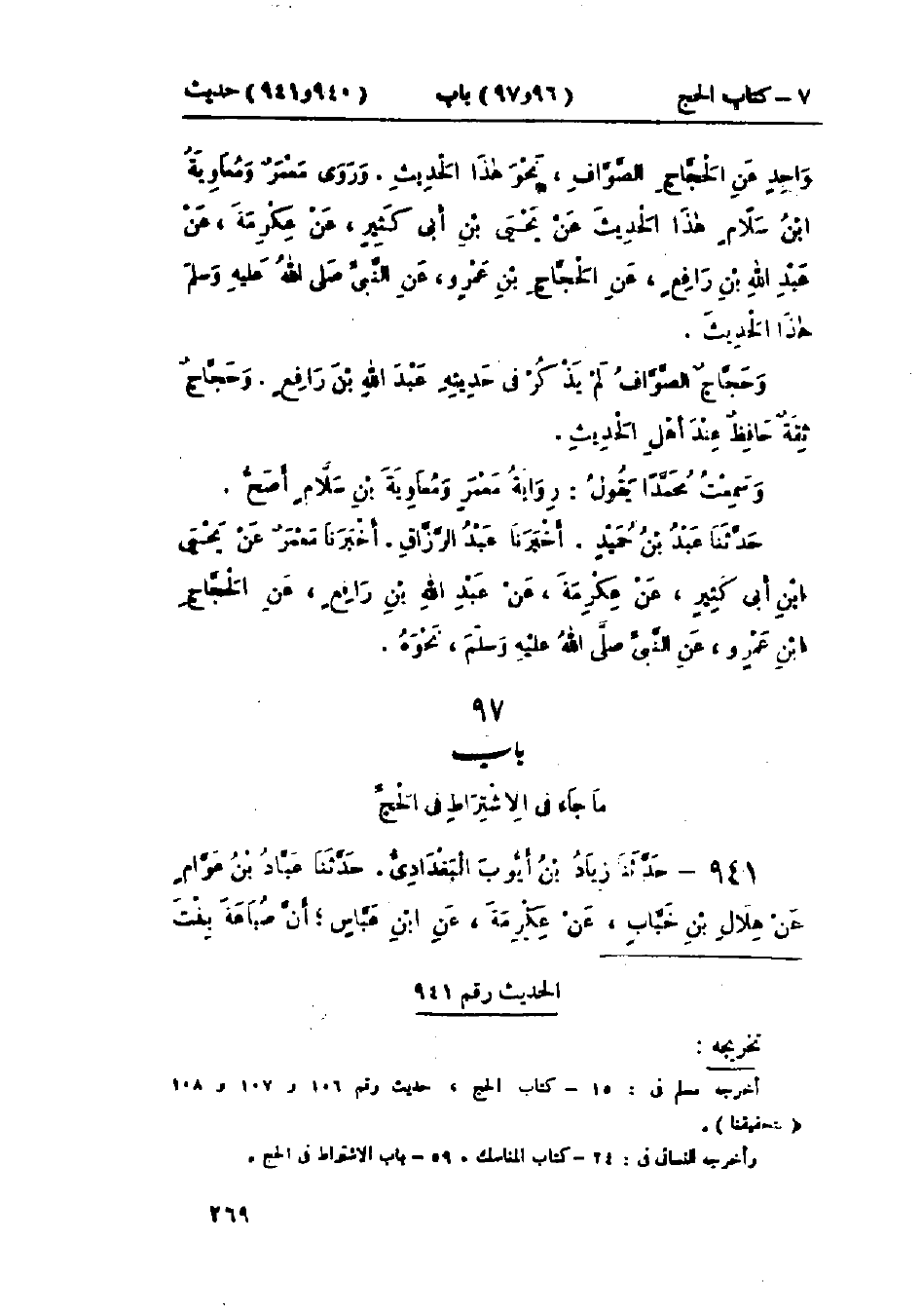 941 - حَدَّثَنَا زِيَادُ بْنُ أَيُّوبَ البَغْدَادِيُّ قَالَ: حَدَّثَنَا عَبَّادُ بْنُ عَوَّامٍ، عَنْ هِلَالِ بْنِ خَبَّابٍ، عَنْ عِكْرِمَةَ، عَنْ ابْنِ عَبَّاسٍ: أَنَّ ضُبَاعَةَ بِنْتَ -[270]- الزُّبَيْرِ أَتَتِ النَّبِيَّ صَلَّى اللَّهُ عَلَيْهِ وَسَلَّمَ، فَقَالَتْ: يَا رَسُولَ اللَّهِ، إِنِّي أُرِيدُ الحَجَّ، أَفَأَشْتَرِطُ؟ قَالَ: «§نَعَمْ»، قَالَتْ: كَيْفَ أَقُولُ؟ قَالَ: «قُولِي لَبَّيْكَ اللَّهُمَّ لَبَّيْكَ، لَبَّيْكَ مَحِلِّي مِنَ الأَرْضِ حَيْثُ تَحْبِسُنِي» وَفِي البَاب عَنْ جَابِرٍ، وَأَسْمَاءَ بِنْتِ أَبِي بَكْرٍ، وَعَائِشَةَ.: حَدِيثُ ابْنِ عَبَّاسٍ حَدِيثٌ حَسَنٌ صَحِيحٌ. وَالعَمَلُ عَلَى هَذَا عِنْدَ بَعْضِ أَهْلِ العِلْمِ يَرَوْنَ الِاشْتِرَاطَ فِي الحَجِّ، وَيَقُولُونَ: إِنْ اشْتَرَطَ فَعَرَضَ لَهُ مَرَضٌ أَوْ عُذْرٌ فَلَهُ أَنْ يَحِلَّ وَيَخْرُجَ مِنْ إِحْرَامِهِ، وَهُوَ قَوْلُ الشَّافِعِيِّ، وَأَحْمَدَ، وَإِسْحَاقَ، وَلَمْ يَرَ بَعْضُ أَهْلِ العِلْمِ الِاشْتِرَاطَ فِي الحَجِّ، وَقَالُوا: إِنْ اشْتَرَطَ فَلَيْسَ لَهُ أَنْ يَخْرُجَ مِنْ إِحْرَامِهِ وَيَرَوْنَهُ كَمَنْ لَمْ يَشْتَرِطْ
