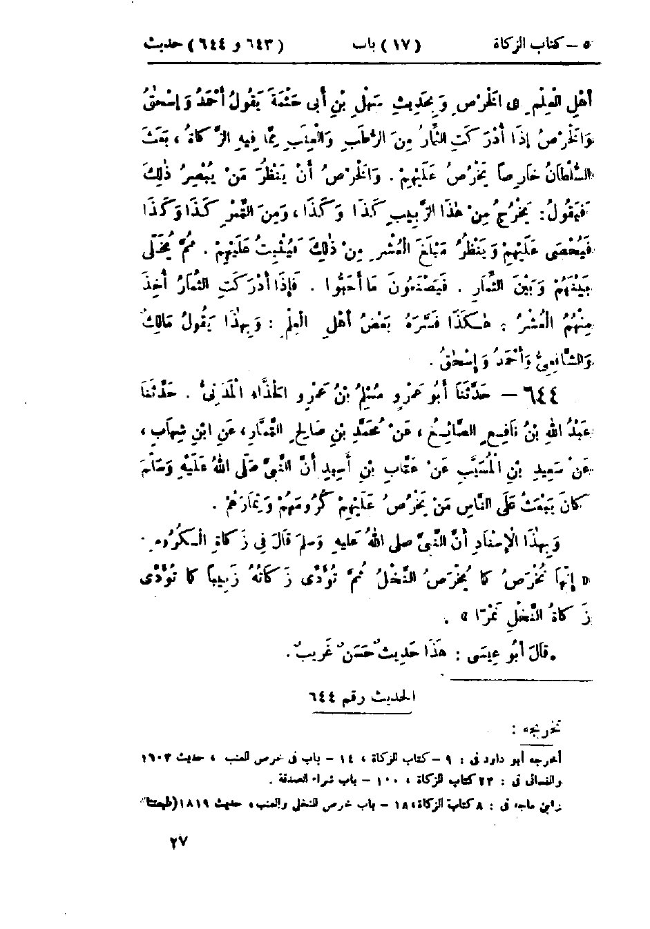 644 - حَدَّثَنَا أَبُو عَمْرٍو مُسْلِمُ بْنُ عَمْرٍو الحَذَّاءُ الْمَدِينِيُّ قَالَ: حَدَّثَنَا عَبْدُ اللَّهِ بْنُ نَافِعٍ، عَنْ مُحَمَّدِ بْنِ صَالِحٍ التَّمَارِ، عَنْ ابْنِ شِهَابٍ، عَنْ سَعِيدِ بْنِ المُسَيِّبِ، عَنْ عَتَّابِ بْنِ أَسِيدٍ، أَنَّ النَّبِيَّ صَلَّى اللَّهُ عَلَيْهِ وَسَلَّمَ كَانَ «§يَبْعَثُ عَلَى النَّاسِ مَنْ يَخْرُصُ عَلَيْهِمْ كُرُومَهُمْ وَثِمَارَهُمْ»