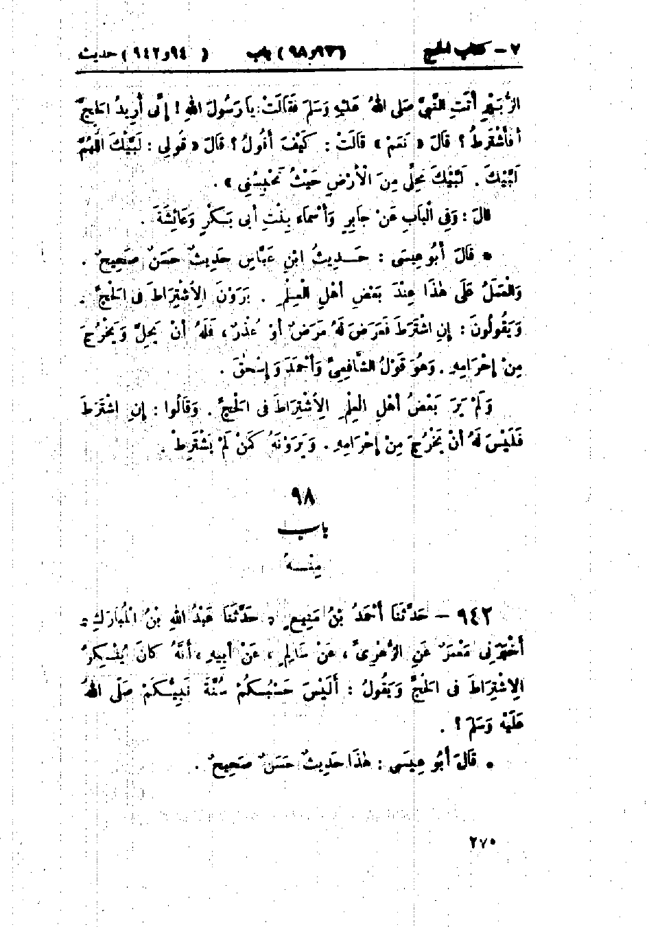 942 - حَدَّثَنَا أَحْمَدُ بْنُ مَنِيعٍ قَالَ: حَدَّثَنَا عَبْدُ اللَّهِ بْنُ المُبَارَكِ قَالَ: أَخْبَرَنِي مَعْمَرٌ، عَنْ الزُّهْرِيِّ، عَنْ سَالِمٍ، عَنْ أَبِيهِ، أَنَّهُ كَانَ §يُنْكِرُ الِاشْتِرَاطَ فِي الحَجِّ، وَيَقُولُ: «أَلَيْسَ حَسْبُكُمْ سُنَّةَ نَبِيِّكُمْ صَلَّى اللَّهُ عَلَيْهِ وَسَلَّمَ»: هَذَا حَدِيثٌ حَسَنٌ صَحِيحٌ