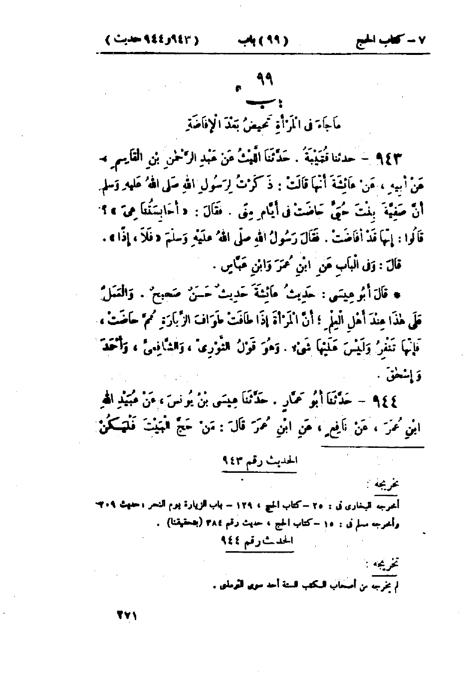 943 - حَدَّثَنَا قُتَيْبَةُ قَالَ: حَدَّثَنَا اللَّيْثُ، عَنْ عَبْدِ الرَّحْمَنِ بْنِ القَاسِمِ، عَنْ أَبِيهِ، عَنْ عَائِشَةَ، أَنَّهَا قَالَتْ: ذَكَرْتُ لِرَسُولِ اللَّهِ صَلَّى اللَّهُ عَلَيْهِ وَسَلَّمَ أَنَّ صَفِيَّةَ بِنْتَ حُيَيٍّ حَاضَتْ فِي أَيَّامِ مِنًى، فَقَالَ: «§أَحَابِسَتُنَا هِيَ؟»، قَالُوا: إِنَّهَا قَدْ أَفَاضَتْ، فَقَالَ رَسُولُ اللَّهِ صَلَّى اللَّهُ عَلَيْهِ وَسَلَّمَ: «فَلَا إِذًا» وَفِي البَاب عَنْ ابْنِ عُمَرَ، وَابْنِ عَبَّاسٍ.: حَدِيثُ عَائِشَةَ حَدِيثٌ حَسَنٌ صَحِيحٌ. وَالعَمَلُ عَلَى هَذَا عِنْدَ أَهْلِ العِلْمِ أَنَّ المَرْأَةَ إِذَا طَافَتْ طَوَافَ الزِّيَارَةِ ثُمَّ حَاضَتْ، فَإِنَّهَا تَنْفِرُ وَلَيْسَ عَلَيْهَا شَيْءٌ، وَهُوَ قَوْلُ الثَّوْرِيِّ، وَالشَّافِعِيِّ، وَأَحْمَدَ، وَإِسْحَاقَ