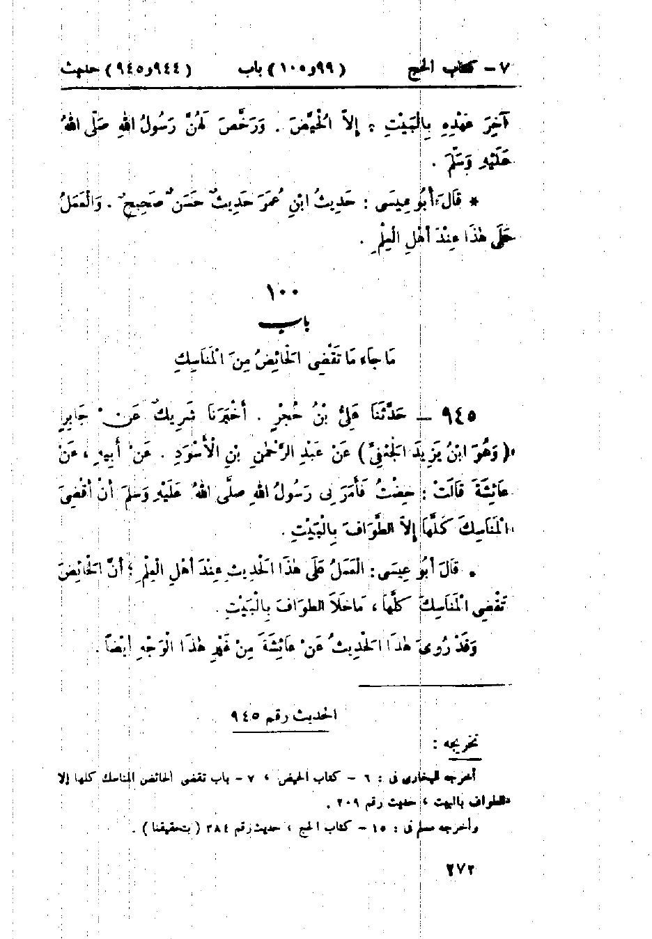 945 - حَدَّثَنَا عَلِيُّ بْنُ حُجْرٍ قَالَ: أَخْبَرَنَا شَرِيكٌ، عَنْ جَابِرٍ وَهُوَ ابْنُ يَزِيدَ الجُعْفِيُّ، عَنْ عَبْدِ الرَّحْمَنِ بْنِ الأَسْوَدِ، عَنْ أَبِيهِ، عَنْ عَائِشَةَ قَالَتْ: «§حِضْتُ فَأَمَرَنِي رَسُولُ اللَّهِ صَلَّى اللَّهُ عَلَيْهِ وَسَلَّمَ أَنْ أَقْضِيَ الْمَنَاسِكَ كُلَّهَا، إِلَّا الطَّوَافَ بِالْبَيْتِ»: وَالْعَمَلُ عَلَى هَذَا الْحَدِيثِ عِنْدَ أَهْلِ الْعِلْمِ: أَنَّ الْحَائِضَ تَقْضِي الْمَنَاسِكَ كُلَّهَا مَا خَلَا الطَّوَافَ بِالْبَيْتِ، وَقَدْ رُوِيَ هَذَا الْحَدِيثُ عَنْ عَائِشَةَ مِنْ غَيْرِ هَذَا الْوَجْهِ أَيْضًا
