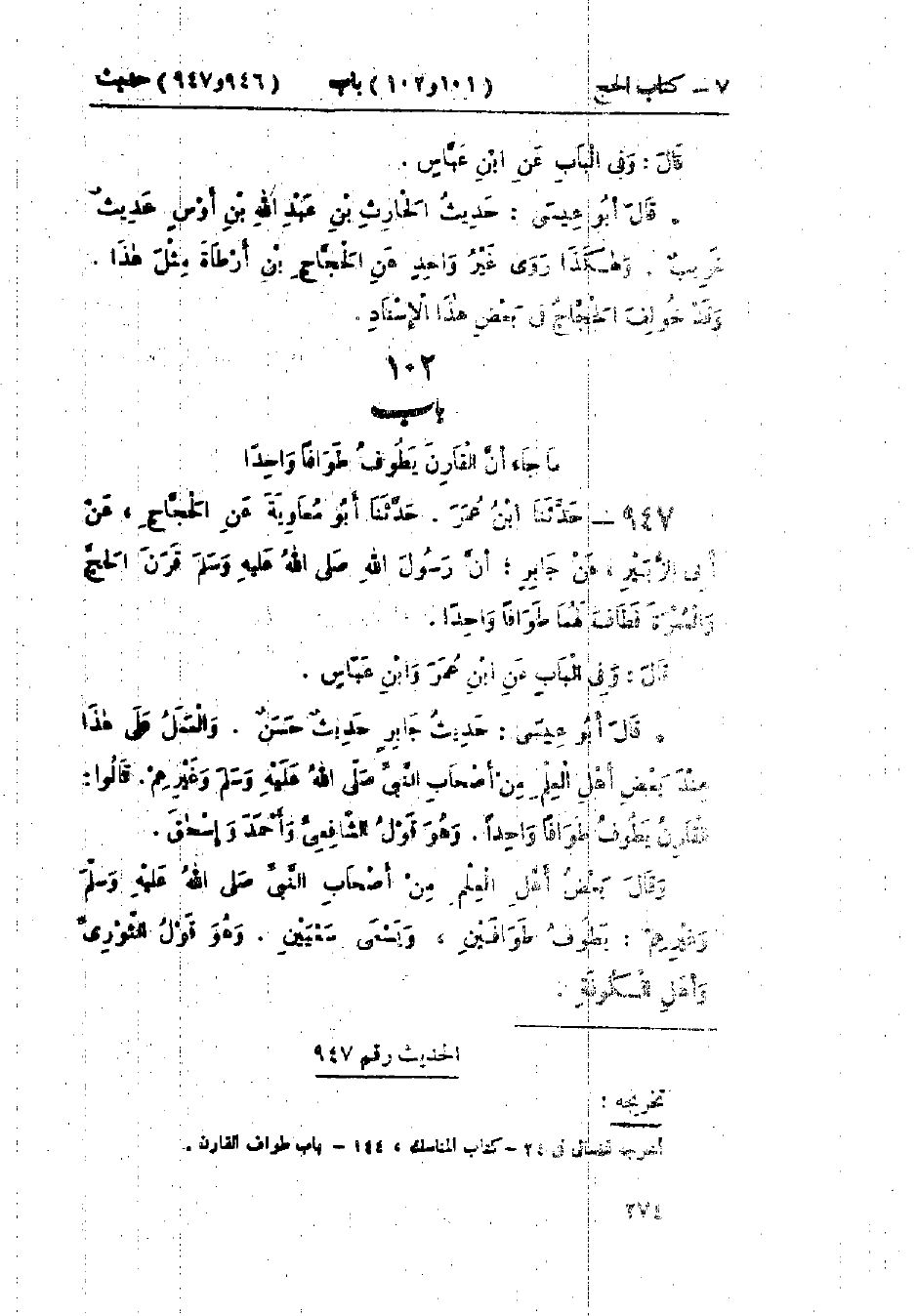 947 - حَدَّثَنَا ابْنُ أَبِي عُمَرَ قَالَ: حَدَّثَنَا أَبُو مُعَاوِيَةَ، عَنْ الحَجَّاجِ، عَنْ أَبِي الزُّبَيْرِ، عَنْ جَابِرٍ، «أَنَّ رَسُولَ اللَّهِ صَلَّى اللَّهُ عَلَيْهِ وَسَلَّمَ §قَرَنَ الحَجَّ وَالعُمْرَةَ، فَطَافَ لَهُمَا طَوَافًا وَاحِدًا» وَفِي البَاب عَنْ ابْنِ عُمَرَ، وَابْنِ عَبَّاسٍ. حَدِيثُ جَابِرٍ حَدِيثٌ حَسَنٌ، وَالعَمَلُ عَلَى هَذَا عِنْدَ بَعْضِ أَهْلِ العِلْمِ مِنْ أَصْحَابِ النَّبِيِّ صَلَّى اللَّهُ عَلَيْهِ وَسَلَّمَ وَغَيْرِهِمْ قَالُوا: القَارِنُ يَطُوفُ طَوَافًا وَاحِدًا، وَهُوَ قَوْلُ الشَّافِعِيِّ، وَأَحْمَدَ، وَإِسْحَاقَ، وقَالَ بَعْضُ أَهْلِ العِلْمِ مِنْ أَصْحَابِ النَّبِيِّ صَلَّى اللَّهُ عَلَيْهِ وَسَلَّمَ وَغَيْرِهِمْ: يَطُوفُ طَوَافَيْنِ، وَيَسْعَى سَعْيَيْنِ، وَهُوَ قَوْلُ الثَّوْرِيِّ، وَأَهْلِ الكُوفَةِ