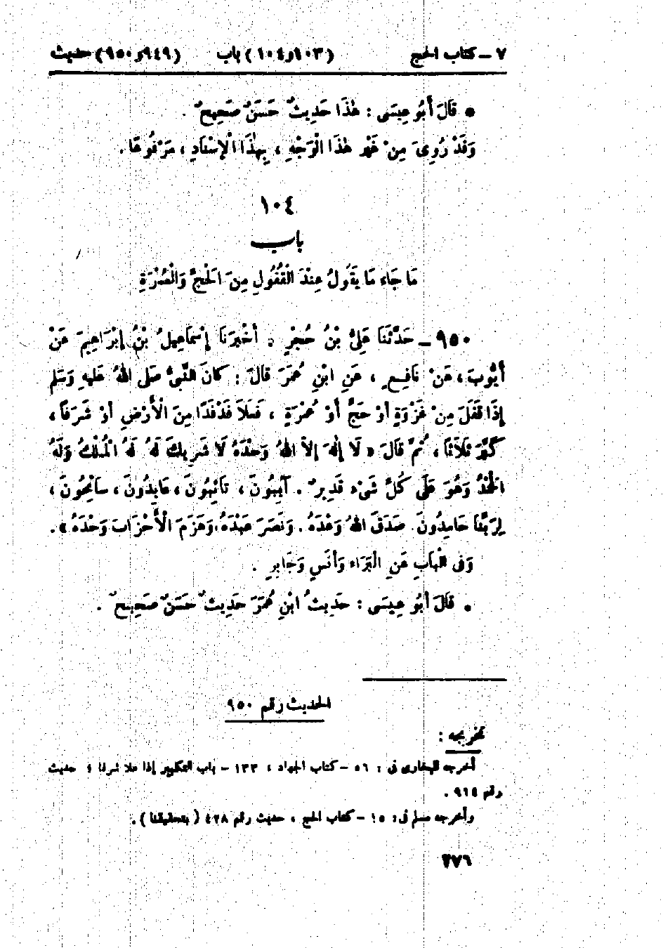 950 - حَدَّثَنَا عَلِيُّ بْنُ حُجْرٍ قَالَ: أَخْبَرَنَا إِسْماَعِيلُ بْنُ إِبْرَاهِيمَ، عَنْ أَيُّوبَ، عَنْ نَافِعٍ، عَنْ ابْنِ عُمَرَ، قَالَ: كَانَ النَّبِيُّ صَلَّى اللَّهُ عَلَيْهِ وَسَلَّمَ إِذَا قَفَلَ مِنْ غَزْوَةً أَوْ حَجٍّ أَوْ عُمْرَةٍ فَعَلَا فَدْفَدًا مِنَ الأَرْضِ أَوْ شَرَفًا كَبَّرَ ثَلَاثًا، ثُمَّ قَالَ: «§لَا إِلَهَ إِلَّا اللَّهُ وَحْدَهُ لَا شَرِيكَ لَهُ، لَهُ المُلْكُ وَلَهُ الحَمْدُ، وَهُوَ عَلَى كُلِّ شَيْءٍ قَدِيرٌ، آيِبُونَ تَائِبُونَ عَابِدُونَ سَائِحُونَ لِرَبِّنَا حَامِدُونَ، صَدَقَ اللَّهُ وَعْدَهُ، وَنَصَرَ عَبْدَهُ، وَهَزَمَ الأَحْزَابَ وَحْدَهُ» وَفِي البَاب عَنْ البَرَاءِ، وَأَنَسٍ، وجَابِرٍ: حَدِيثُ ابْنِ عُمَرَ حَدِيثٌ حَسَنٌ صَحِيحٌ