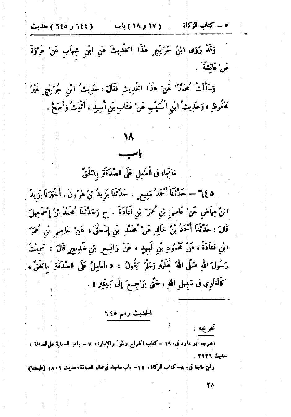 645 - حَدَّثَنَا أَحْمَدُ بْنُ مَنِيعٍ قَالَ: حَدَّثَنَا يَزِيدُ بْنُ هَارُونَ قَالَ: أَخْبَرَنَا يَزِيدُ بْنُ عِيَاضٍ، عَنْ عَاصِمِ بْنِ عُمَرَ بْنِ قَتَادَةَ، ح وحَدَّثَنَا مُحَمَّدُ بْنُ إِسْمَاعِيلَ، قَالَ: حَدَّثَنَا أَحْمَدُ بْنُ خَالِدٍ، عَنْ مُحَمَّدِ بْنِ إِسْحَاقَ، عَنْ عَاصِمِ بْنِ عُمَرَ بْنِ قَتَادَةَ، عَنْ مَحْمُودِ بْنِ لَبِيدٍ، عَنْ رَافِعِ بْنِ خَدِيجٍ قَالَ: سَمِعْتُ رَسُولَ اللَّهِ صَلَّى اللَّهُ عَلَيْهِ وَسَلَّمَ يَقُولُ: «§العَامِلُ عَلَى الصَّدَقَةِ بِالحَقِّ كَالغَازِي فِي سَبِيلِ اللَّهِ حَتَّى يَرْجِعَ إِلَى بَيْتِهِ»: -[29]- «حَدِيثُ رَافِعِ بْنِ خَدِيجٍ حَدِيثٌ حَسَنٌ، وَيَزِيدُ بْنُ عِيَاضٍ ضَعِيفٌ عِنْدَ أَهْلِ الحَدِيثِ، وَحَدِيثُ مُحَمَّدِ بْنِ إِسْحَاقَ أَصَحُّ»