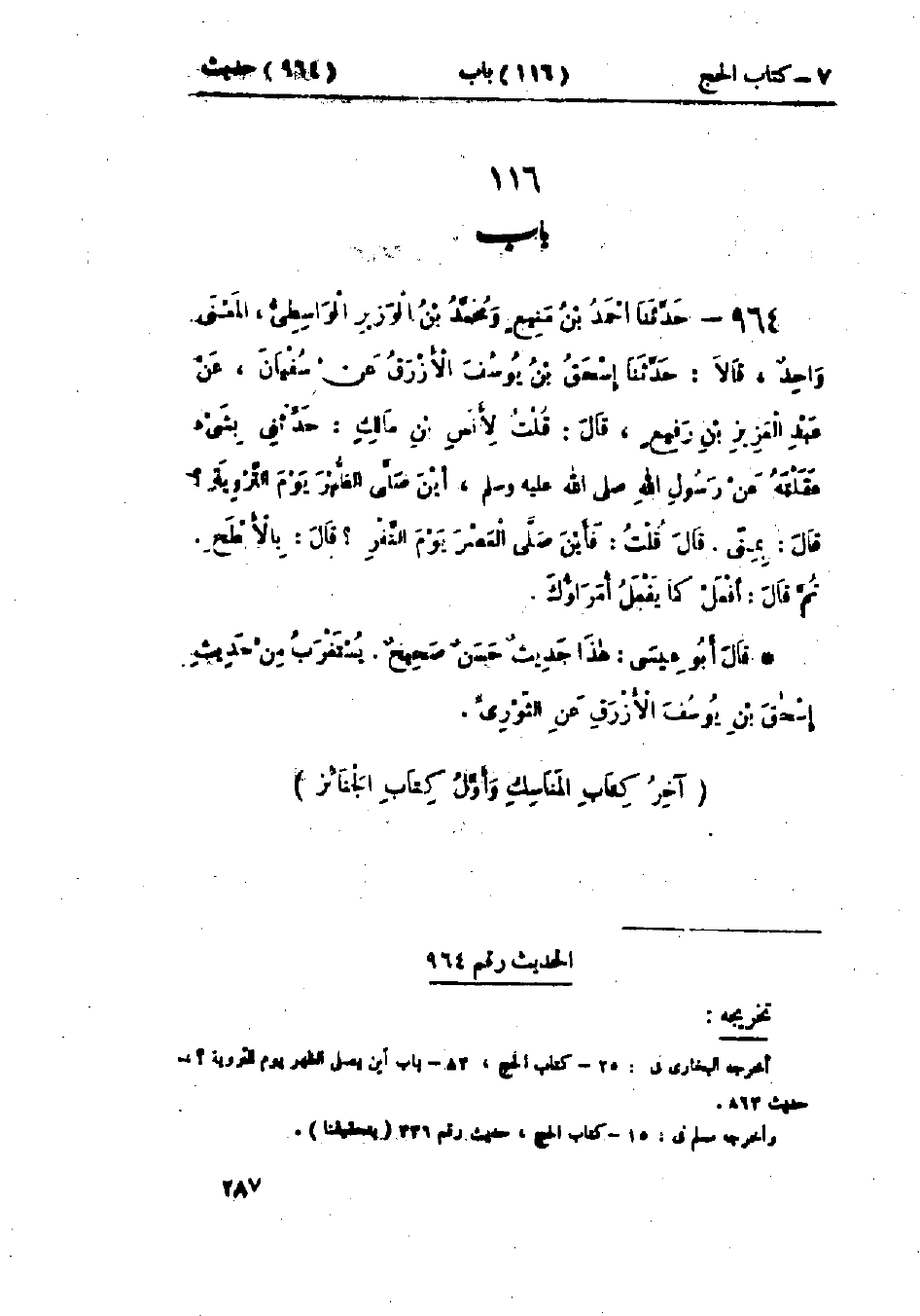964 - حَدَّثَنَا أَحْمَدُ بْنُ مَنِيعٍ، وَمُحَمَّدُ بْنُ الوَزِيرِ الوَاسِطِيُّ المَعْنَى وَاحِدٌ، قَالَا: حَدَّثَنَا إِسْحَاقُ بْنُ يُوسُفَ الأَزْرَقُ، عَنْ سُفْيَانَ، عَنْ عَبْدِ العَزِيزِ بْنِ رُفَيْعٍ، قَالَ: قُلْتُ لِأَنَسِ بْنِ مَالِكٍ حَدِّثْنِي بِشَيْءٍ عَقَلْتَهُ عَنْ رَسُولِ اللَّهِ صَلَّى اللَّهُ عَلَيْهِ وَسَلَّمَ، أَيْنَ §صَلَّى الظُّهْرَ يَوْمَ التَّرْوِيَةِ؟ قَالَ: «بِمِنًى». قَالَ: قُلْتُ: فَأَيْنَ صَلَّى العَصْرَ يَوْمَ النَّفْرِ؟ قَالَ: «بِالأَبْطَحِ»، ثُمَّ قَالَ: «افْعَلْ كَمَا يَفْعَلُ أُمَرَاؤُكَ»: هَذَا حَدِيثٌ حَسَنٌ صَحِيحٌ، يُسْتَغْرَبُ مِنْ حَدِيثِ إِسْحَاقَ بْنِ يُوسُفَ الأَزْرَقِ، عَنِ الثَّوْرِيِّ