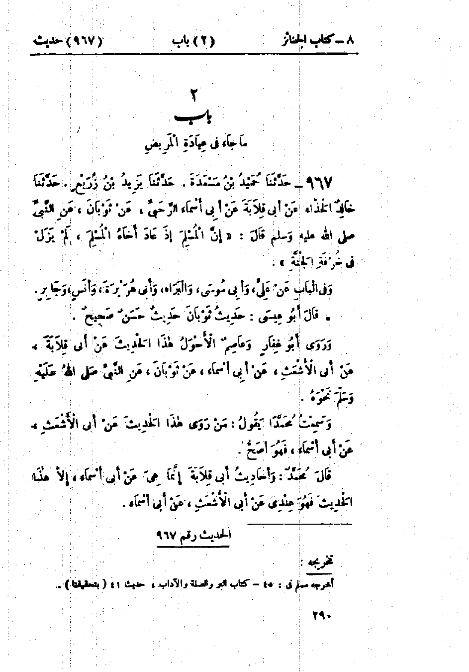 967 - حَدَّثَنَا حُمَيْدُ بْنُ مَسْعَدَةَ قَالَ: حَدَّثَنَا يَزِيدُ بْنُ زُرَيْعٍ قَالَ: حَدَّثَنَا خَالِدٌ الحَذَّاءُ، عَنْ أَبِي قِلَابَةَ، عَنْ أَبِي أَسْمَاءَ الرَّحَبِيِّ، عَنْ ثَوْبَانَ، عَنِ النَّبِيِّ صَلَّى اللَّهُ عَلَيْهِ وَسَلَّمَ قَالَ: «§إِنَّ المُسْلِمَ إِذَا عَادَ أَخَاهُ المُسْلِمَ لَمْ يَزَلْ فِي خُرْفَةِ الجَنَّةِ» وَفِي البَاب عَنْ عَلِيٍّ، وَأَبِي مُوسَى، وَالبَرَاءِ، وَأَبِي هُرَيْرَةَ، وَأَنَسٍ، وَجَابِرٍ: «حَدِيثُ ثَوْبَانَ حَدِيثٌ حَسَنٌ» وَرَوَى أَبُو غِفَارٍ، وَعَاصِمٌ الأَحْوَلُ هَذَا الحَدِيثَ، عَنْ أَبِي قِلَابَةَ، عَنْ أَبِي الأَشْعَثِ، عَنْ أَبِي أَسْمَاءَ، عَنْ ثَوْبَانَ، عَنِ النَّبِيِّ صَلَّى اللَّهُ عَلَيْهِ وَسَلَّمَ نَحْوَهُ. وَسَمِعْتُ مُحَمَّدًا يَقُولُ: «مَنْ رَوَى هَذَا الحَدِيثَ، عَنْ أَبِي الأَشْعَثِ، عَنْ أَبِي أَسْمَاءَ فَهُوَ أَصَحُّ»، قَالَ مُحَمَّدٌ: «وَأَحَادِيثُ أَبِي قِلَابَةَ إِنَّمَا هِيَ، عَنْ أَبِي أَسْمَاءَ إِلَّا هَذَا الحَدِيثَ فَهُوَ عِنْدِي عَنْ أَبِي الأَشْعَثِ، عَنْ أَبِي أَسْمَاءَ».