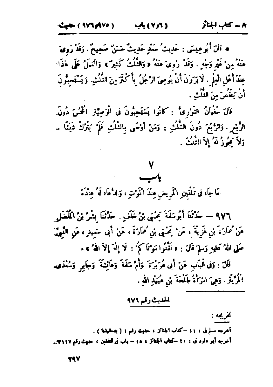 976 - حَدَّثَنَا أَبُو سَلَمَةَ يَحْيَى بْنُ خَلَفٍ قَالَ: حَدَّثَنَا بِشْرُ بْنُ المُفَضَّلِ، عَنْ عُمَارَةَ بْنِ غَزِيَّةَ، عَنْ يَحْيَى بْنِ عُمَارَةَ، عَنْ أَبِي سَعِيدٍ، عَنِ النَّبِيِّ صَلَّى اللَّهُ عَلَيْهِ وَسَلَّمَ قَالَ: «§لَقِّنُوا مَوْتَاكُمْ لَا إِلَهَ إِلَّا اللَّهُ» وَفِي البَاب عَنْ أَبِي هُرَيْرَةَ، وَأُمِّ سَلَمَةَ، وَعَائِشَةَ، وَجَابِرٍ، وَسُعْدَى المُرِّيَّةِ وَهِيَ امْرَأَةُ طَلْحَةَ بْنِ عُبَيْدِ اللَّهِ.: -[298]- «حَدِيثُ أَبِي سَعِيدٍ حَدِيثٌ حَسَنٌ صَحِيحٌ غَرِيبٌ»