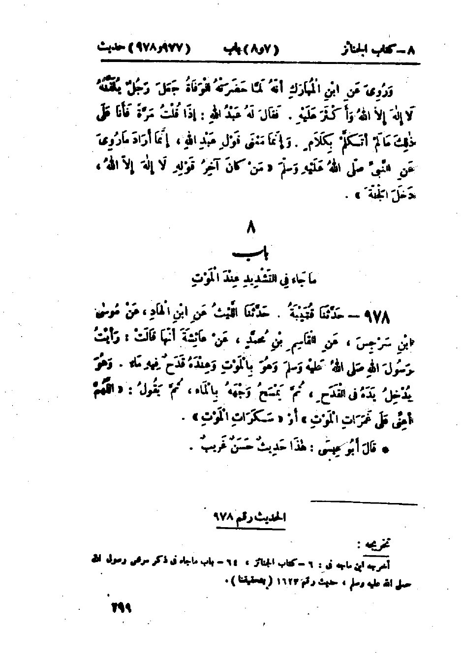 978 - حَدَّثَنَا قُتَيْبَةُ قَالَ: حَدَّثَنَا اللَّيْثُ، عَنْ ابْنِ الهَادِ، عَنْ مُوسَى بْنِ سَرْجِسَ، عَنْ القَاسِمِ بْنِ مُحَمَّدٍ، عَنْ عَائِشَةَ، أَنَّهَا قَالَتْ: رَأَيْتُ رَسُولَ اللَّهِ صَلَّى اللَّهُ عَلَيْهِ وَسَلَّمَ وَهُوَ بِالمَوْتِ، وَعِنْدَهُ قَدَحٌ فِيهِ مَاءٌ، وَهُوَ يُدْخِلُ يَدَهُ فِي القَدَحِ، ثُمَّ يَمْسَحُ وَجْهَهُ بِالمَاءِ، ثُمَّ يَقُولُ: «§اللَّهُمَّ أَعِنِّي عَلَى غَمَرَاتِ المَوْتِ أَوْ سَكَرَاتِ المَوْتِ»: هَذَا حَدِيثٌ غَرِيبٌ