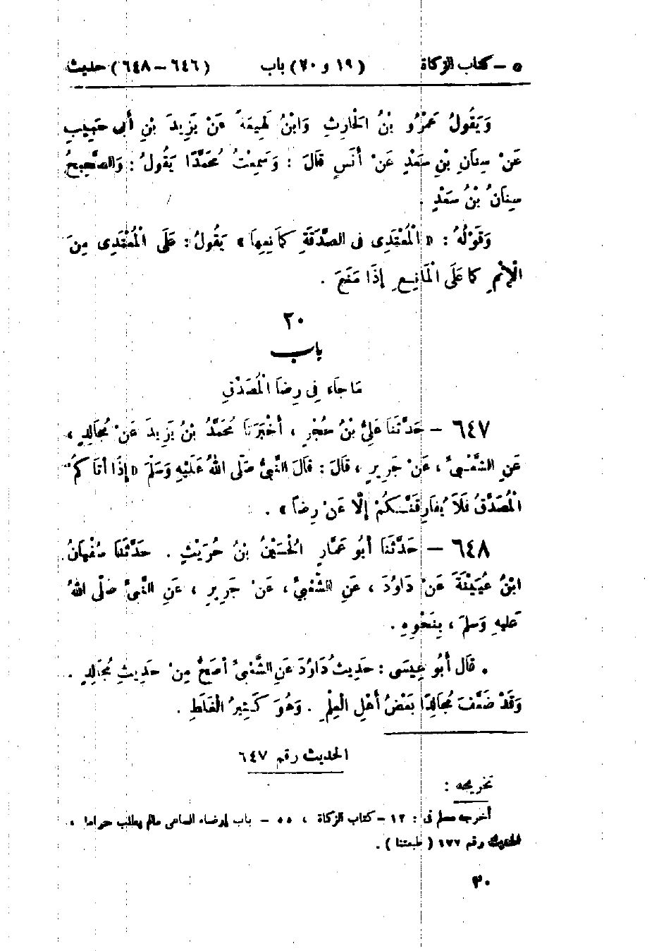 647 - حَدَّثَنَا عَلِيُّ بْنُ حُجْرٍ قَالَ: أَخْبَرَنَا مُحَمَّدُ بْنُ يَزِيدَ، عَنْ مُجَالِدٍ، عَنْ الشَّعْبِيِّ، عَنْ جَرِيرٍ قَالَ: قَالَ النَّبِيُّ صَلَّى اللَّهُ عَلَيْهِ وَسَلَّمَ: «§إِذَا أَتَاكُمُ المُصَدِّقُ فَلَا يُفَارِقَنَّكُمْ إِلَّا عَنْ رِضًا»