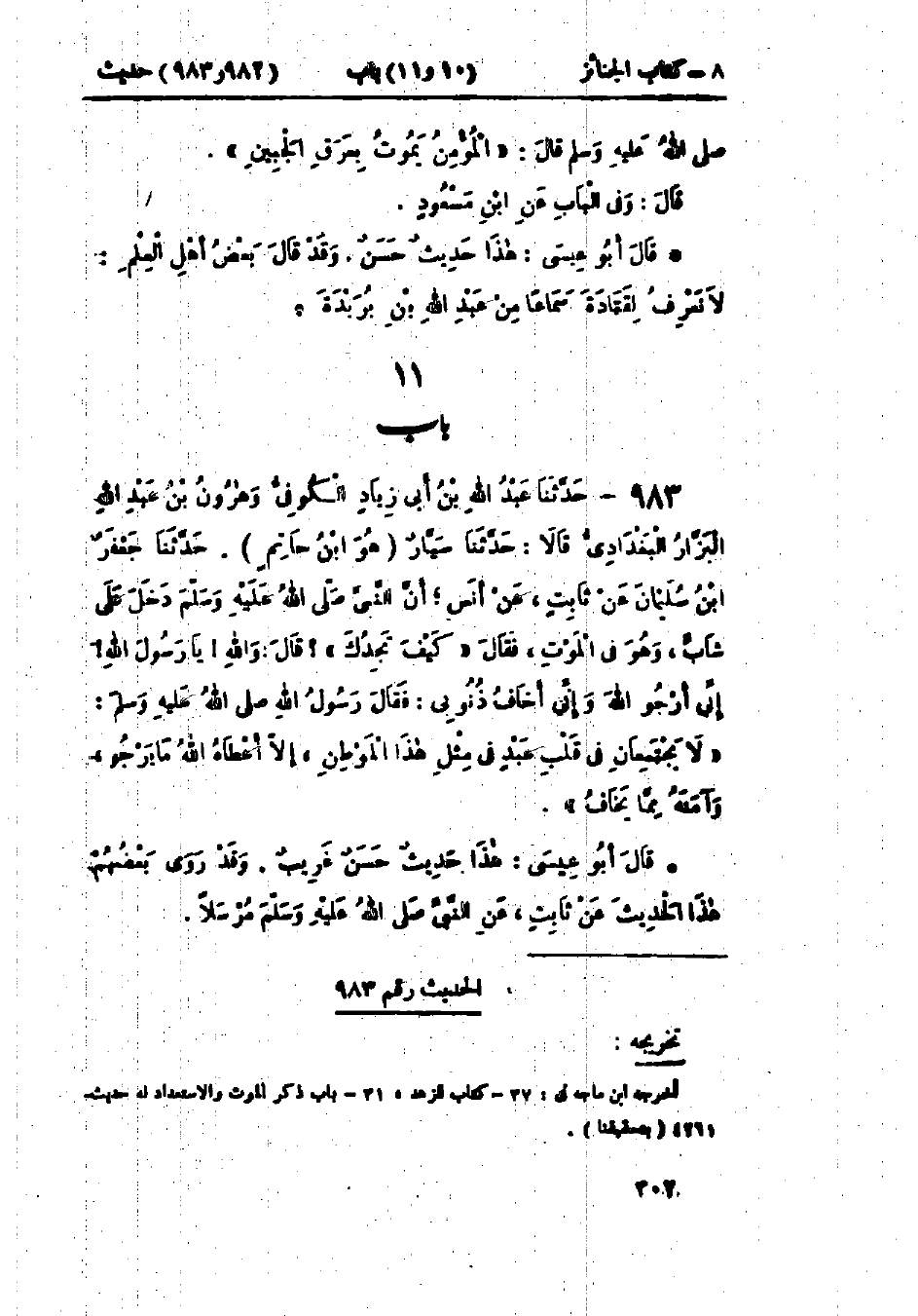 983 - حَدَّثَنَا عَبْدُ اللَّهِ بْنُ الْحَكَمِ بْنِ أَبِي زِيَادٍ الْكُوفِيُّ، وَهَارُونُ بْنُ عَبْدِ اللَّهِ الْبَزَّارُ الْبَغْدَادِيُّ، قَالَا: حَدَّثَنَا سَيَّارٌ هُوَ ابْنُ حَاتِمٍ قَالَ: حَدَّثَنَا جَعْفَرُ بْنُ سُلَيْمَانَ، عَنْ ثَابِتٍ، عَنْ أَنَسٍ، أَنَّ النَّبِيَّ صَلَّى اللَّهُ عَلَيْهِ وَسَلَّمَ دَخَلَ عَلَى شَابٍّ وَهُوَ فِي المَوْتِ، فَقَالَ: «كَيْفَ تَجِدُكَ؟»، قَالَ: وَاللَّهِ يَا رَسُولَ اللَّهِ، إِنِّي أَرْجُو اللَّهَ، وَإِنِّي أَخَافُ ذُنُوبِي، فَقَالَ رَسُولُ اللَّهِ صَلَّى اللَّهُ عَلَيْهِ وَسَلَّمَ: «§لَا يَجْتَمِعَانِ فِي قَلْبِ عَبْدٍ فِي مِثْلِ هَذَا المَوْطِنِ إِلَّا أَعْطَاهُ اللَّهُ مَا يَرْجُو وَآمَنَهُ مِمَّا يَخَافُ»: هَذَا حَدِيثٌ غَرِيبٌ وَقَدْ رَوَى بَعْضُهُمْ هَذَا الحَدِيثَ، عَنْ ثَابِتٍ، عَنِ النَّبِيِّ صَلَّى اللَّهُ عَلَيْهِ وَسَلَّمَ مُرْسَلًا