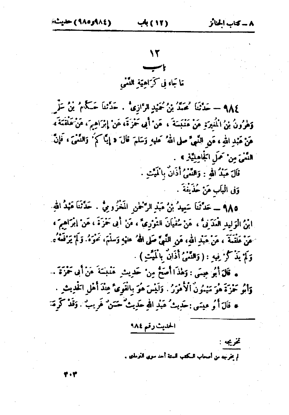 984 - حَدَّثَنَا مُحَمَّدُ بْنُ حُمَيْدٍ الرَّازِيُّ قَالَ: حَدَّثَنَا حَكَّامُ بْنُ سَلْمٍ، وَهَارُونُ بْنُ المُغِيرَةِ، عَنْ عَنْبَسَةَ، عَنْ أَبِي حَمْزَةَ، عَنْ إِبْرَاهِيمَ، عَنْ عَلْقَمَةَ، عَنْ عَبْدِ اللَّهِ، عَنِ النَّبِيِّ صَلَّى اللَّهُ عَلَيْهِ وَسَلَّمَ قَالَ: «§إِيَّاكُمْ وَالنَّعْيَ، فَإِنَّ النَّعْيَ مِنْ عَمَلِ الجَاهِلِيَّةِ» قَالَ عَبْدُ اللَّهِ: وَالنَّعْيُ: أَذَانٌ بِالمَيِّتِ، وَفِي البَاب عَنْ حُذَيْفَةَ.